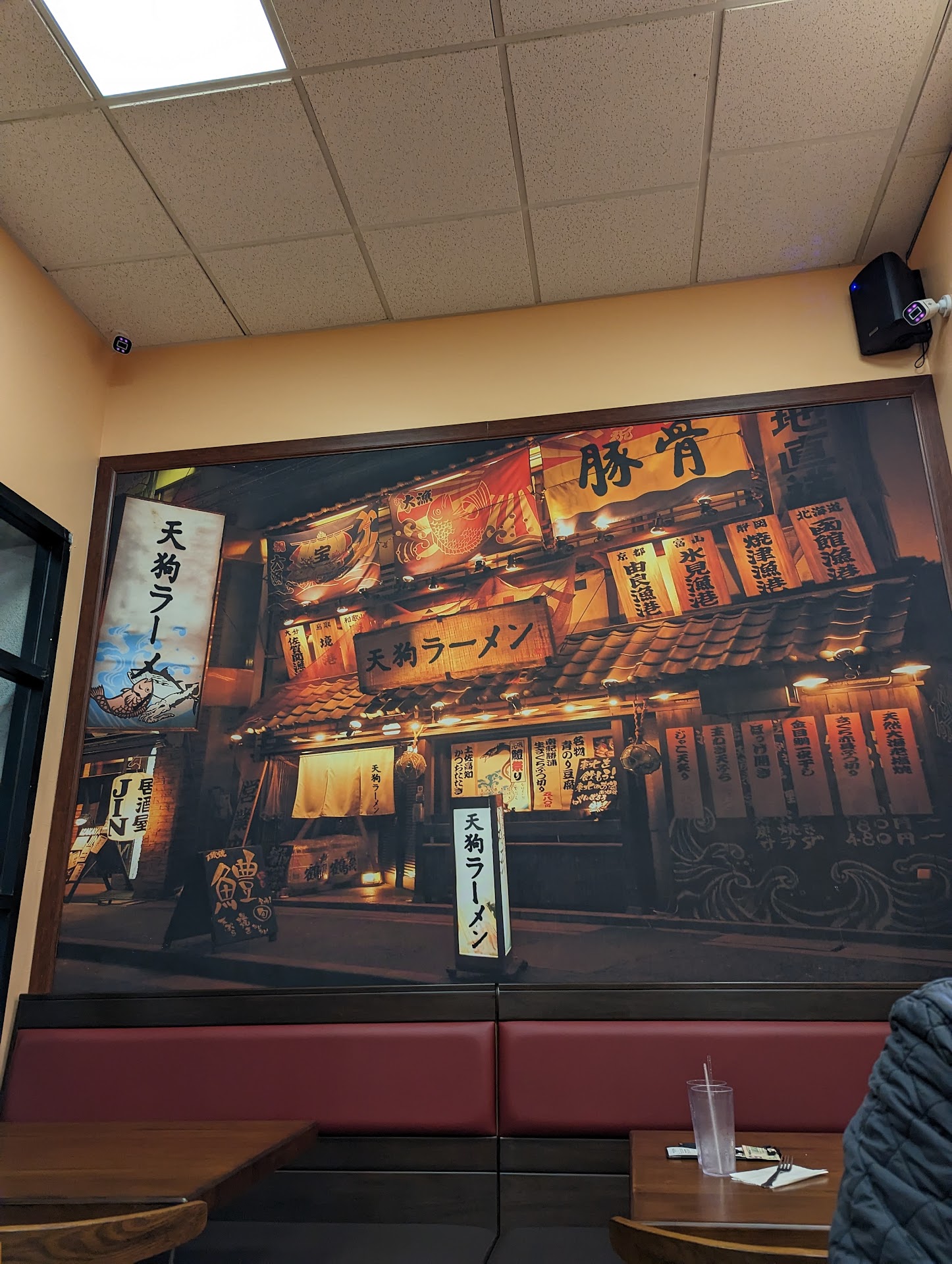 The interior decor was extremely immersive, with gigantic wall-to-wall wallpaper depicting a kind of "Tokyo City Street Bar" vibe and a Japanese Anime soundtrack playlist bumping for ambiance. There were also Asian character figurines and other assorted decorations which all accentuated to the experience of being in an authentic ramen shop.