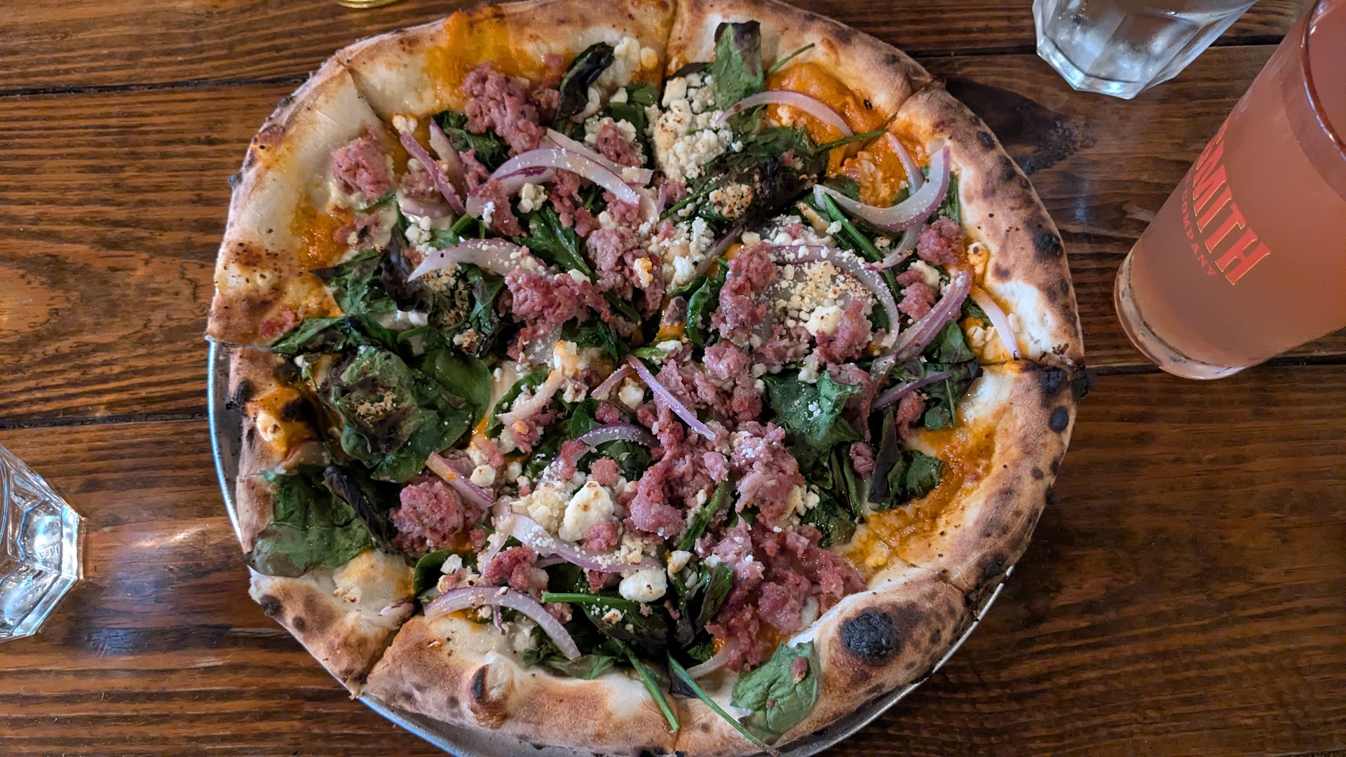 FOOD: Yummy thin crust coal fired pizza, good but not overwhelming selection of craft and mass market beers and wine, and great desserts (see note). On the day we went, we had the chicken wings, Fennel Sausage Pie, cheesecake, creme brulee, and zeppole.