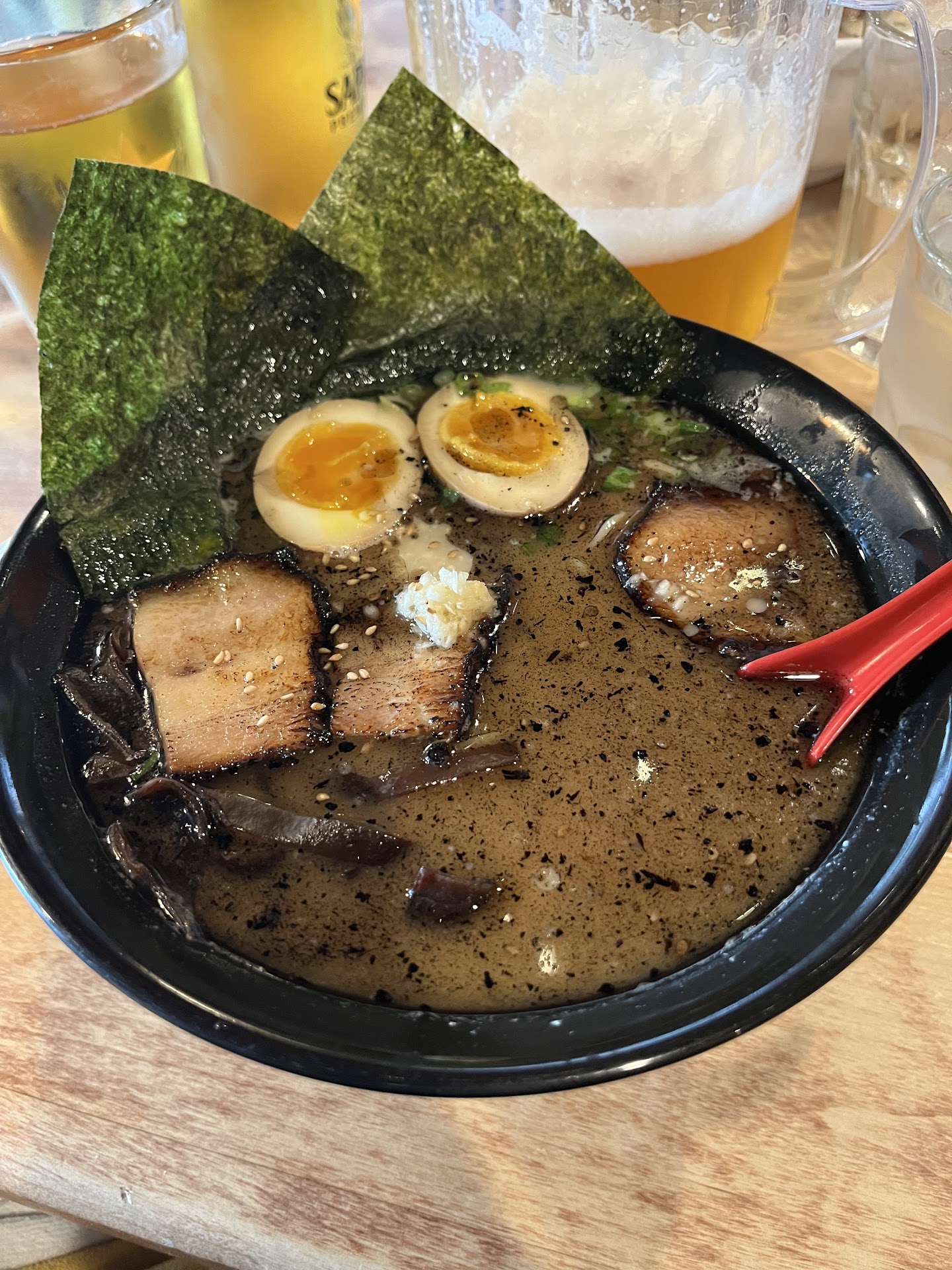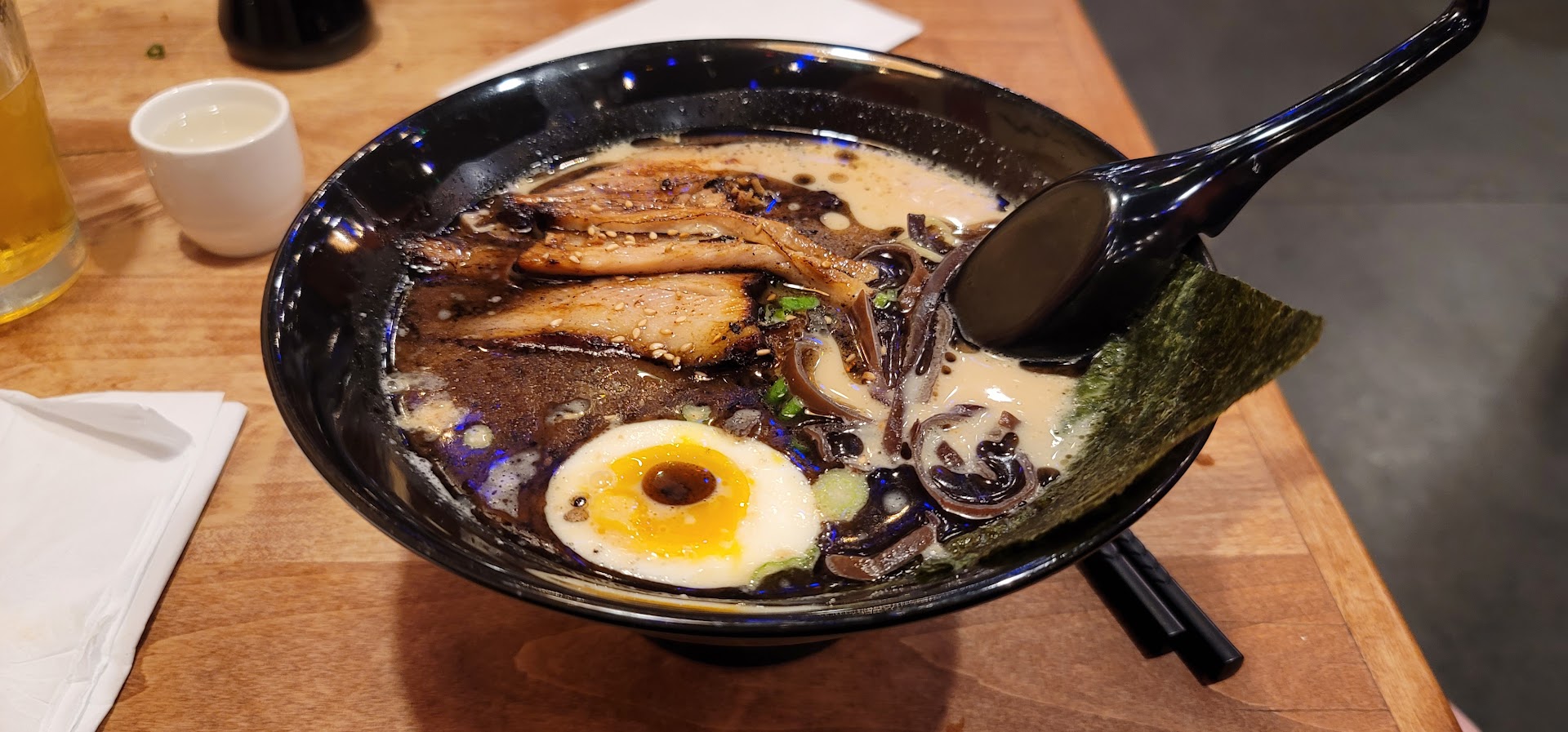 We had the black knight ramen which had a very thick and savory tonkatsu broth with black garlic oil and extra garlic on top. The veggies included wood ear mushroom and some seaweed. A seasoned egg was extra but totally worth it. The center was perfectly jammy and the white was well seasoned.
