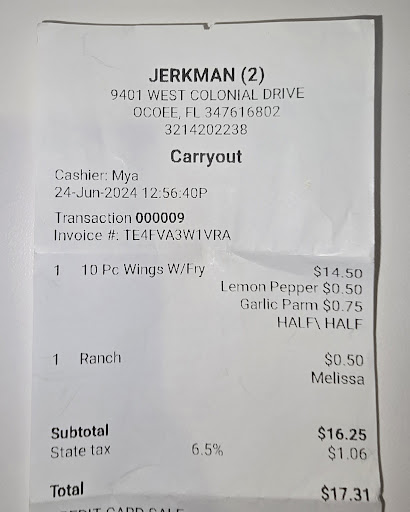 Ā Ā Ā Read moreI waited over an hour and never received my food! I order on the website and ordered delivery. Jerkman is partnered with Uber eats and the delivery driver took my food. I contacted Uber eats but since I ordered on the website jerkman had to contact Uber eats for me to receive my refund. I donāt know if I spoke to the owner himself but I was told to send my confirmation number and I would receive my money back. After I sent him my info I never received anything back I canāt get a text back or a phone call answered. I advise you not to order delivery! What happened to me can...