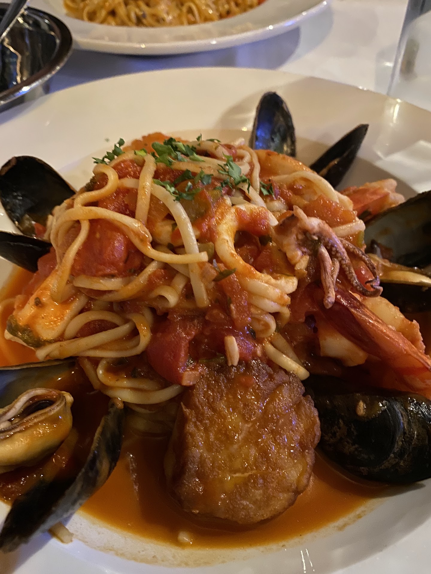 Our waitress was lovely and very attentive, however we would have appreciated some acknowledgement or solution when she asked us if we would be back again and my husband said I don’t know. She visibly saw my husband now eating my dinner with his plate still loaded with pasta and only the few pieces of shell fish he was provided consumed. We asked before ordering if the pasta was homemade again for the price I would expect it to be. She said it was not. We ordered the dish anyway because really Italian food is all in the flavor.
