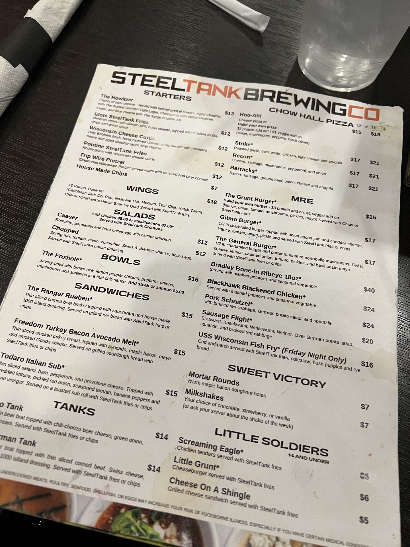 Not what I brewery should be! I only leave reviews if something is outstanding or something really went wrong... Jessie B's service was absolutely awful! First off, Jessie snapped at my 86yo grandmother for pointing out the chicken strips and correcting her multiple times that it was from the kids menu. Absolutely understood, but the approach was unacceptable! Being that this was a birthday lunch and it's difficult to move an elderly 86yo person, we were committed to the experience. Given that there were other servers tending to their tables, and the "brewery" was less than half full, there is no way our drinks should take 20min to bring out. Apps came out, and after about 10 min, we had to flag her down and ask for plates. Food was OK at best. Pretzel must have been in a warmer a little too long, the burger was just dripping in grease, and there was no red cabbage left. Jessie offered to substitute with extra spätzle, but that obviously didn't happen. Plates and trays from apps were not removed, and it was like playing table Tetris and putting plates on the bench for us to just flag her down again. Menus need to be wiped clean of food, and torn menus should be replaced. Positive that it is veteran owned, but if service continues like this, Steel Tank will be...
