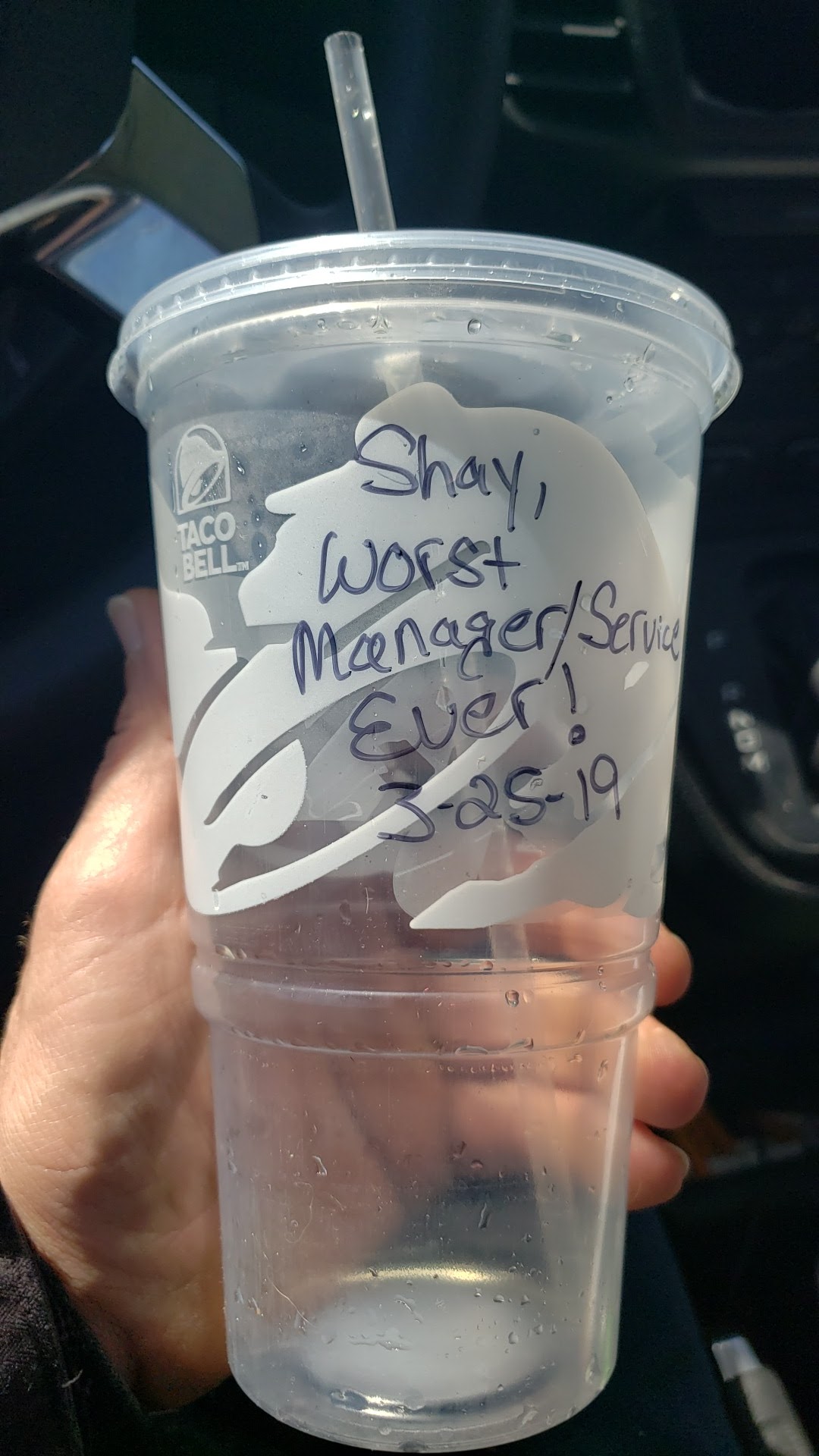 Read moreLet me start out by saying WORST TACO BELL EVER. The manager Shay was extremely rude, very un professional, hickeys all over her neck, she was a horrible human being. I pre ordered on my app, was told 5-8 minutes. I got to the restuarant and there were 4 or 5 people who were before and after me besides people in drive through . I told her that I had a pre order she said ok. Then she proceeded to take other orders as they came after mine. She looks out at me and says oh they are small orders . My wife and I worked a long day and just wanted to eat. 15 minutes later I had luckily got in touch with the general manager (he was a great guy) he told her hey he has been waiting 15 minutes with a pre order you need to get it done. I eventually got my food, however it was pretty much thrown down on the counter to me by Shay. I asked her seriously, she made yet another snide comment. Next the order was called in for dining there, she bagged it all up and tried to send me on my way. This is probably THE WORST CUSTOMER SERVICE I HAVE EVER RECEIVED IN MY ENTIRE LIFE. I am going to contact corporate about Shay and her management skills, or lack there of. I only wish I lived closer to a different taco bell as I never want to...