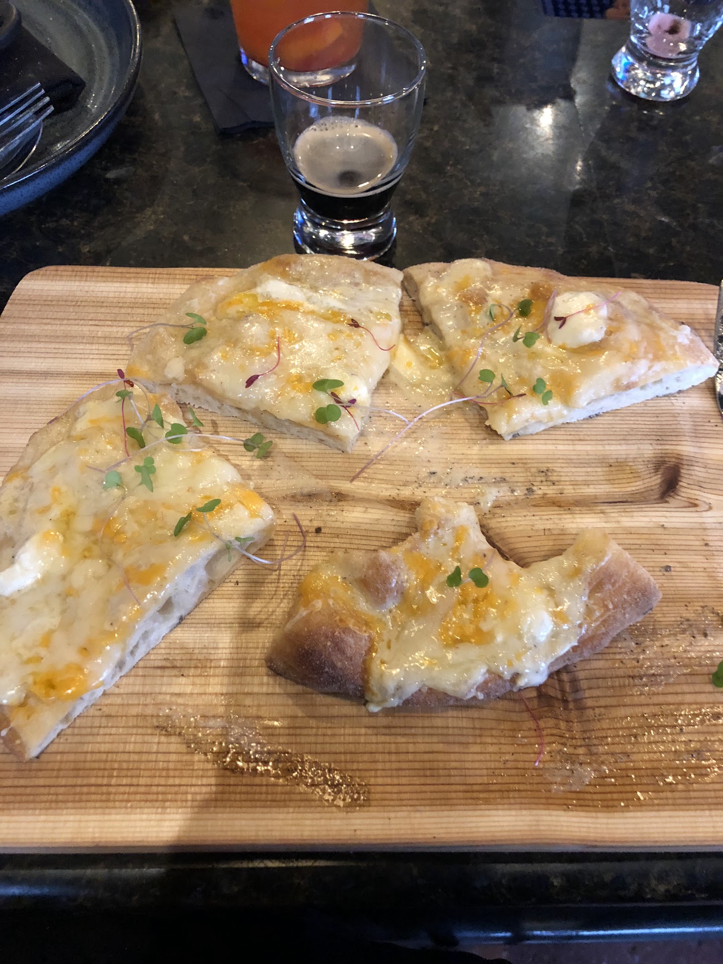 Our youngest, the pickiest eater, was able to order butter noodles with parm, not on the menu. Made our life easier, he was delighted. My wife got the Artichoke pasta bowl with chicken. She ate most of it, didnt complain but didn't praise it either. I'm guessing she'd go back and order it again but it wouldn't drive her to suggest the place. My other, oldest, child and I ordered cheeseburgers. My oldest loves burgers, so he was excited it was an option. I was eye-ing up the $35 ribeye but we decided to order an app and I didn't want to spend that much knowing I might not finish whatever I got. I ordered mine with aged cheddar, as did my child, plus I added some bacon. My burger came as ordered but the cheese was light and either cooled after being molton or never fully melted. It's that coagulated state where the texture is odd and it changes the flavor a bit. Plus, there was so little of it, it appeared as if it was a thin layer of spreadable cheese. Probably a good thing seeing how it wasnt hot anyway. My child's burger came without his cheese and this was the one place the server(s) failed. Another server brought it out without cheese, we let her know, and she said she'd let our server know, leaving the naked burger (sitting open faced as they bring it out) just sitting. It took a few minutes for our server to return and take the plate back to the kitchen. The kitchen partially (again) melted some cheese on top and the plate was returned to the table. So barely melted you could still see the pieces of shred. The potato buns are a bit odd for a burger but seemed very fresh. The meat in the burger was high quality but under seasoned.