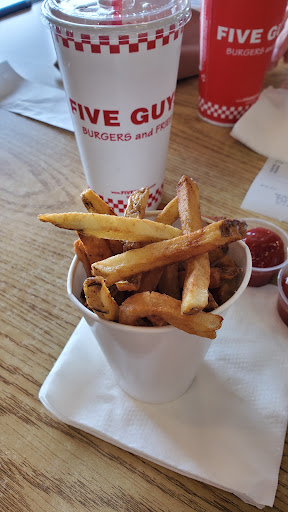 Read moređđThe food served here is delicious, although I've never tried the burgers there. I've only ever tried the "dogs"(hot dogs) which I know as a long burger which, I hope, is as good as the burgers, maybe the burgers are better, they say the burgers are made exceptionally well, as well as the fries, and I think I would agree if I tried the burgers. I have tried the fries and they are DELICIOUS, therefore I gave it a five star rating, because I dont wanna be one of those people who find one downside and deduct a star just so they can be better. Five guys deserves a five star rating for being the best they can...