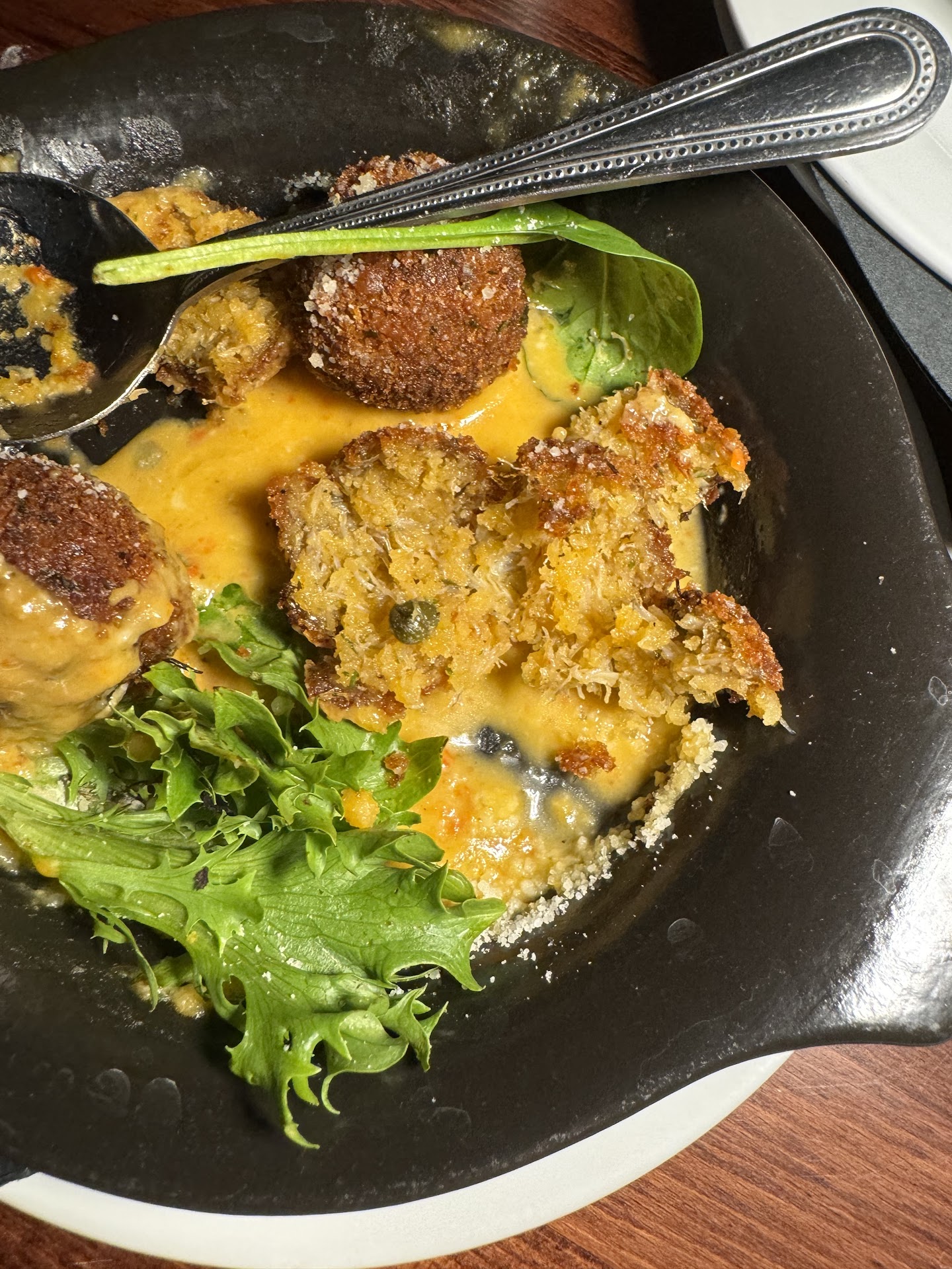 How disappointing. This is a long review because I’m Pissed. TERRIBLE SERVICE and overpriced food I read all the great reviews. Maybe it was an off night idk I have been on a road trip with my 12 yr old and 2 yr old camping and hiking for days . We had on the road for 6 hrs and were so hungry . I wanted a nice dinner . Read reviews and made reservations. We checked in hotel and ran to eat. Now like I said I have a 2 yr old who has been in car all day. So I had a window of time to get dinner and out before there was a melt down. Let’s start with the waitress brought 2 waters. There were 3 of us I asked her if she could bring a drink for my 2 yr old daughter. She said we only have “to go cups” umhhhhh okay can you bring her one. SHE NEVER DID. Crab cakes are basically sweet hush puppies. And truffle fries taste like normal fries. I really wanted to try a few things on the menu after camping for a few days but After that I was nervous to order multiple $60 dishes Couldn’t decide between salad and chicken. The waitress was rushing me acting aggravated by my questions Asked me if I wanted to add meat to my salad I said yes, steak. Then she said it will be a whole steak . Okay , what cuts . You can get a filet it will be an extra $46. Umhhh I’m still asking about what kind , I didn’t ask the price yet. But I was getting irritated so I said don’t worry about it . I asked her for a drink menu . She NEVER brought it. But all the couples with men at the table she was helping all had drink menus and were getting drinks back to back. I had to ask someone else for a drink menu , a drink for my 2 year old and ordered a drink.