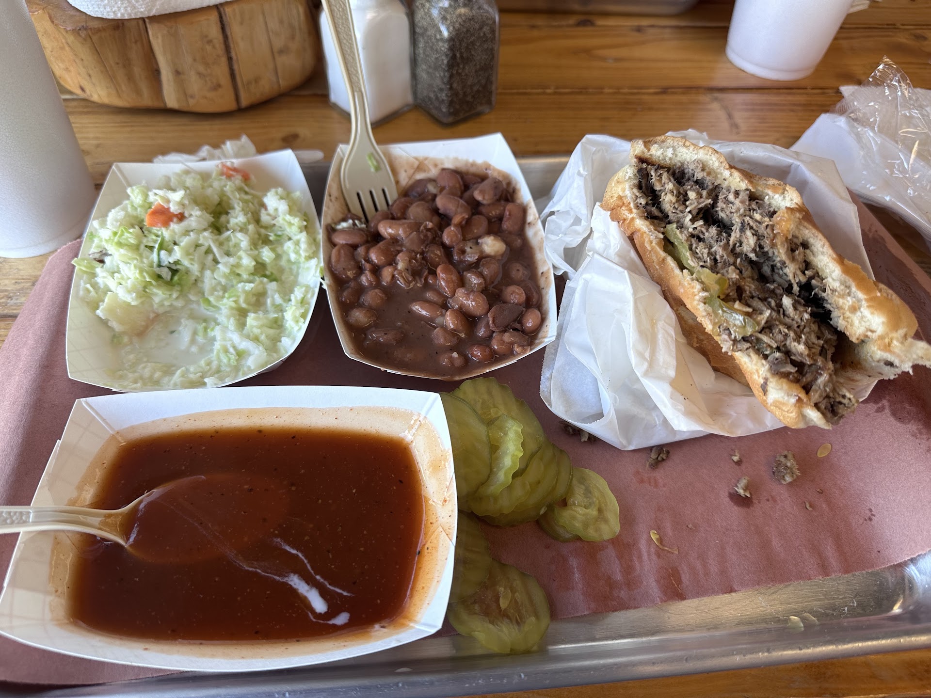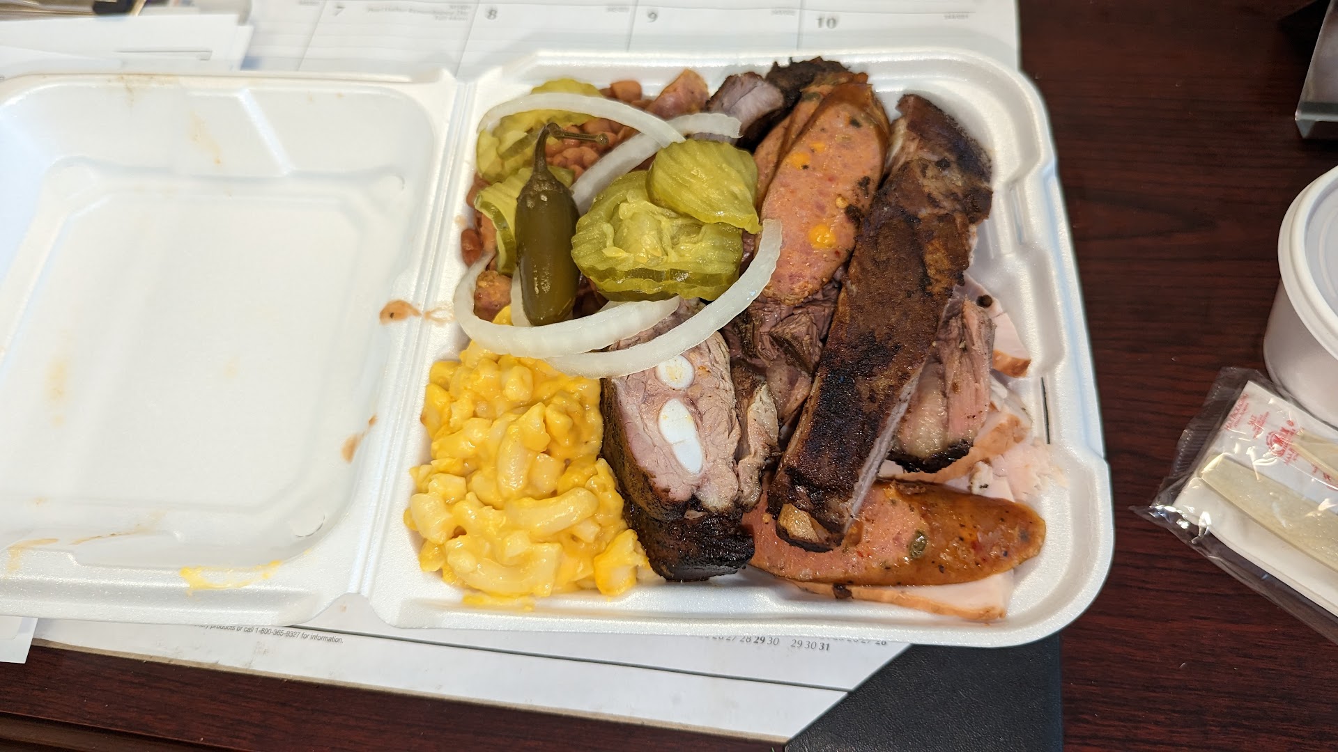 Read moreI went here for the first time a few months back. It's sad, but I will not be going back again. I ordered through the drive through. The person taking my order was very nice and friendly. I asked for suggestions. I had the 2 meat plate brisket and sausage with potatoes and green beans and a roll, I also ordered the blackberry cobbler which sounded oh so good. I was extremely disappointed with everything except the mashed potatoes and the green beans- they were excellent. However 15 or more dollars for mashed potatoes and green beans was not a great deal. There was a respectable amount of Brisket on the plate. The brisket was watery and included a watery BBQ sauce that lacked any depth or flavor. The sausage was of poor quality. I am picky about my sausage and I always go for the better sausage at the grocery store. I should have went to the grocery store, this sausage had no real flavor and was full more of fat than any seasonings. The blackberry cobbler was squishy, doughy and not all the way cooked. This broke my heart. I was expecting a meal of good smoked meat with plenty of seasoning and sauce on the side if needed. I got a watery, flavorless, greasy, doughy uncooked mess. I honestly would go back for the green beans and mashed potatoes because they were super good, but only for the sides. I was so disappointed in the whole meal, although a decent size meal, it had no flavor and no seasoning...