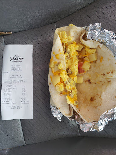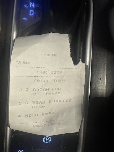 The cashier handed me a bag containing both orders. Upon arriving in Austin and opening the bag, I was shocked to discover that instead of the ground beef and cheese burritos, I had received two bacon, egg, and cheese burritos and one bean and cheese burrito—none of which I ordered.