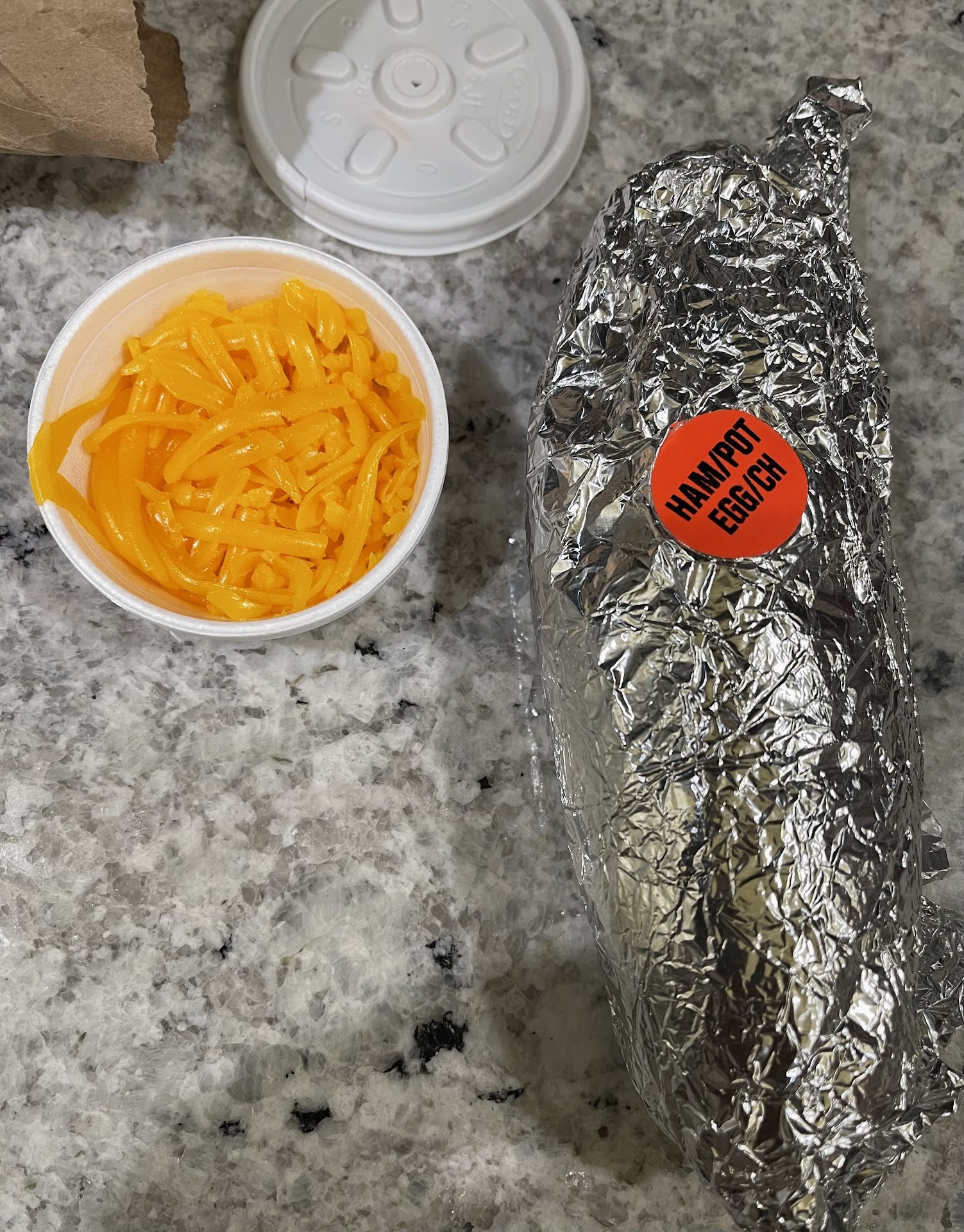 Read moreSo this is the Jumburrito. First off please remove jumbo from the name. Train your workers to hand out the complete order. I almost didn't get my coffee but I regret getting it because the coffee was like they put a half a teaspoon of instant coffee in a liter of water. When I asked the employee for cream and sugar I was given a dirty look and only given 2 sugar packets. So now the burrito. The eggs fried in margerine obviously mixed with undercooked potato chunks and a cold type of cheese that doesn't melt easily. Leading me to believe it a very low quality cheese. The sausage is the kind you find on cheap microwavable pizza. The sauce is blended green tomato with a chemical that makes it super hot probably what they use for hot chips. SAVE YOUR MONEY!!! AVOID...