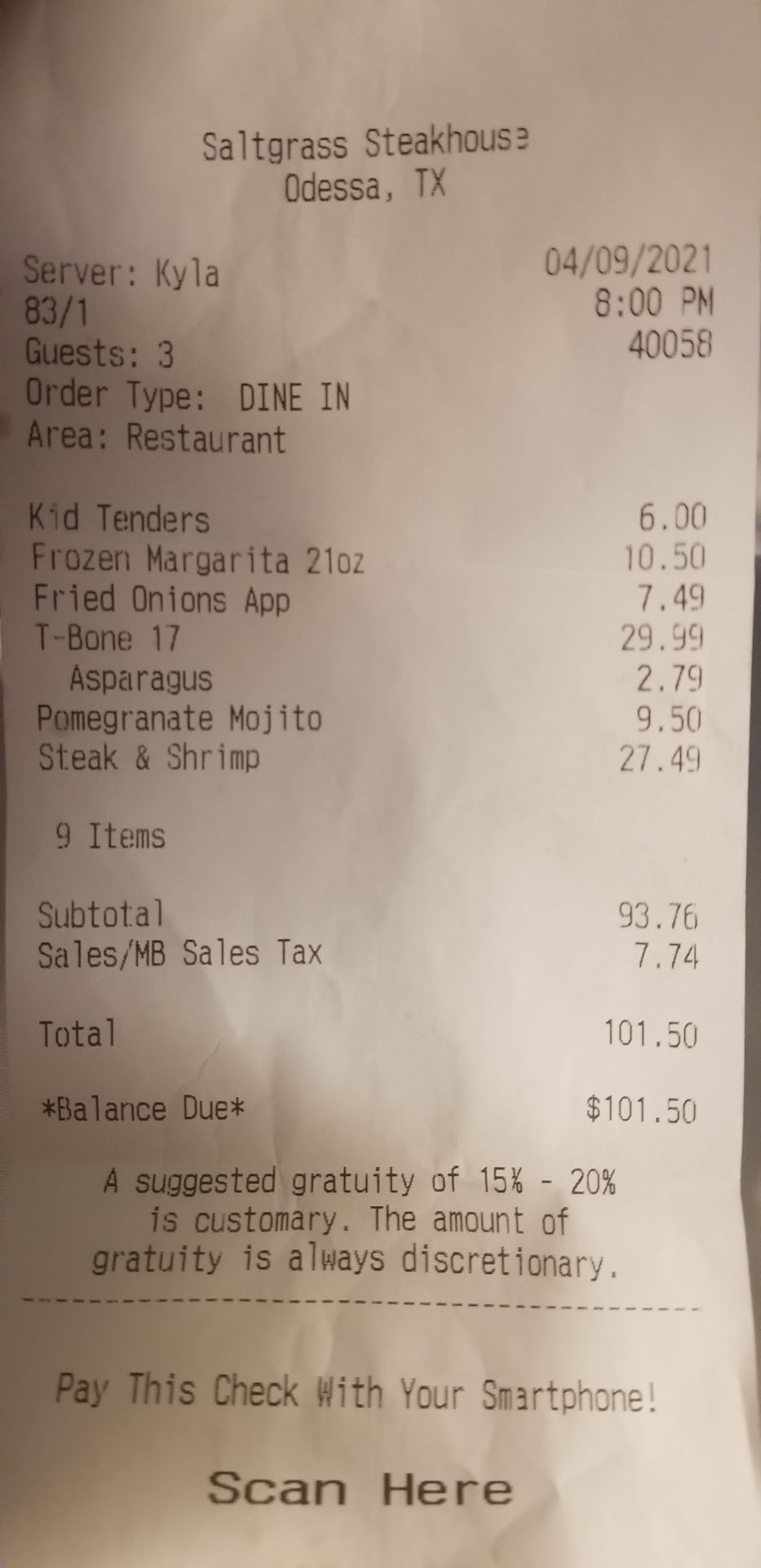 We had the most horrible service at the Saltgrass in Odessa, TX last night!!! To start it off after waiting 45 minutes (which we expect on a Saturday night), we here told we where next to be seated, I saw the list myself and there where 7 other parties listed below my name to be seated. SO….after waiting ANOTHER 30 minutes we go in to check what’s going on to find out my name was removed from the list (as I was able to see the tablet and my name was no longer there) and all the other parties that where after us where already seated! I requested to see a manager the manager came and stated your table is now finally ready, let’s get you seated! No explanation why my name was passed over!!! Now remember this is now close to closing time and there where only 4 tables left once we where seated! It took 20 minutes to get our drinks and appetizer ordered, we then ordered our food! Nothing we ordered was complicating, We ordered a kids chicken finger, a hamburger and the fish. Why after an hour of waiting (from when we ordered) did we have to ask where our food was at! The manager came to our table again and said our food was ordered only 24 minutes ago and it was about to come out! At this point we are extremely mad and tell him to pack up our food and give us our ticket! The waiter comes to the table with our ticket (with only our drinks and appetizer listed) and NO FOOD! (I was not requesting anything to be compensated, we just wanted to get out of there as it was almost 10:30pm) We where wanting to pay for the whole ticket including our food we ordered!!!