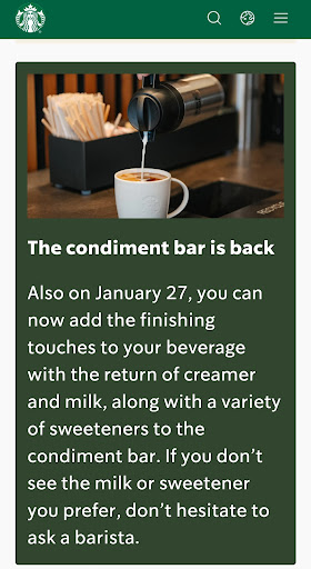 We love this location and we have been coming here for years mainly because of some of the staff that is really nice and outside seating. However they don't seem to be a "participant store" in any of Starbucks promotions (like the free refills on brewed tea/coffee implemented sinceJanuary). Also, they have been fast in implementing the new policies of charging for water and close the restrooms, but not the one of having the condiment bar back or the place clean for customers (outside seating is almost always dirty). We have started to go to a different location sometimes because of these issues. Nothing changes...