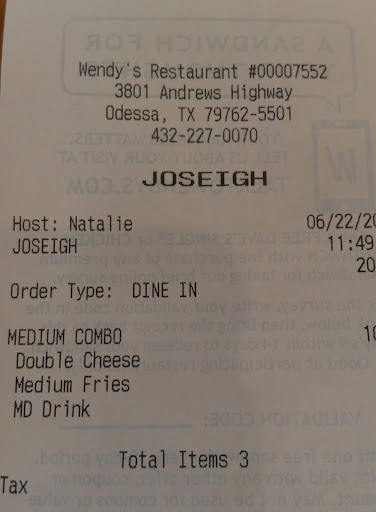 Ā Ā Ā Read moreI'm actually a bit upset. Me and my mom went around lunch time and ordered a good amount of food, and when we had gotten home, we noticed our large fries were missing. So my mom called off of my phone, and maybe we got the name wrong, but we spoke to a Claudia and left our name to pick up the fries later, since we live across town. We went back to Wendy's after 3 the exact same day, and the same woman who gave us our order, answered the window saying we had the wrong Wendy's and was giving us a hard time about some $3 fries and made us talk to the manager. Even then, after explaining our order and situation again, he looked like he didn't believe us either. Why would we go in the drive-thru for "free" fries when we had paid for them. Like, why would we lie about that? So here's the receipt of our order that we DID NOT lie about, and the same number we called to with the time on it, which was NOT the wrong Wendy's we called to. Next time, they need to trust...