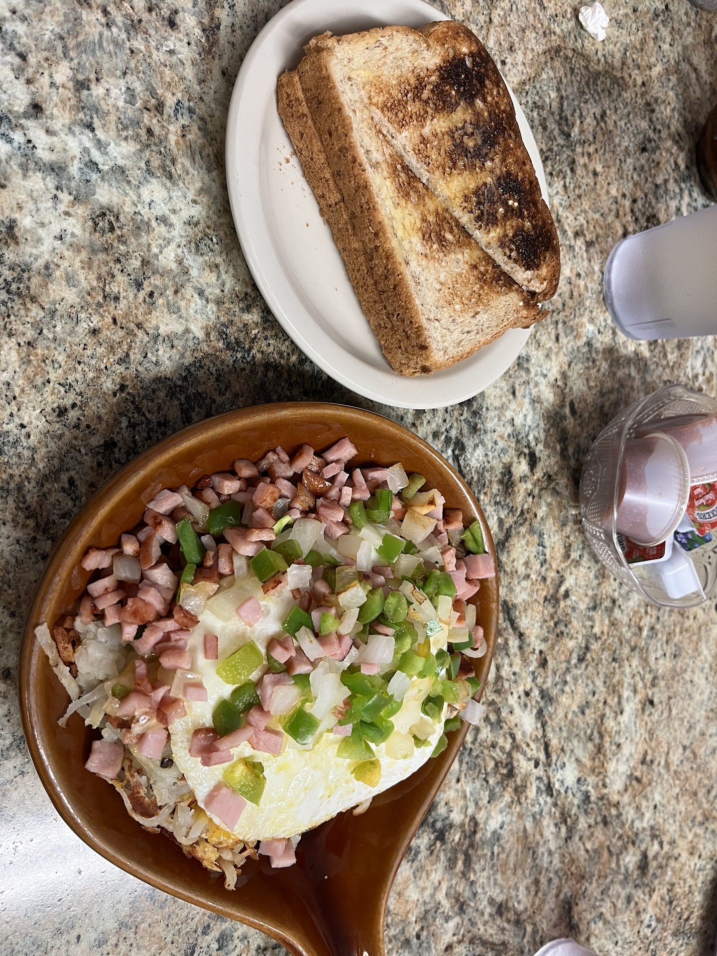 We order our food. My wife’s comes out about 5 minutes before mine. It’s supposed to be a skillet but it’s actually a cheap layered dish: undercooked hash browns, scrambled eggs, a slice of Kraft fake cheese, some thawed out frozen bell peppers, and canned mushrooms. This is an $11 dish. The toast, which was supposed to be sourdough, was white bread. When my wife pointed this out the waitress went and swung a bag of bread around insisting it was sourdough, she toasted it herself, it’s just that “our sourdough bread doesn’t really taste that sourdough”. Really? So then don’t advertise that you have sourdough if your sourdough is actually old crusty white bread. She was also kind enough to butter it with that fake movie popcorn butter that sits in your stomach for hours without digesting.