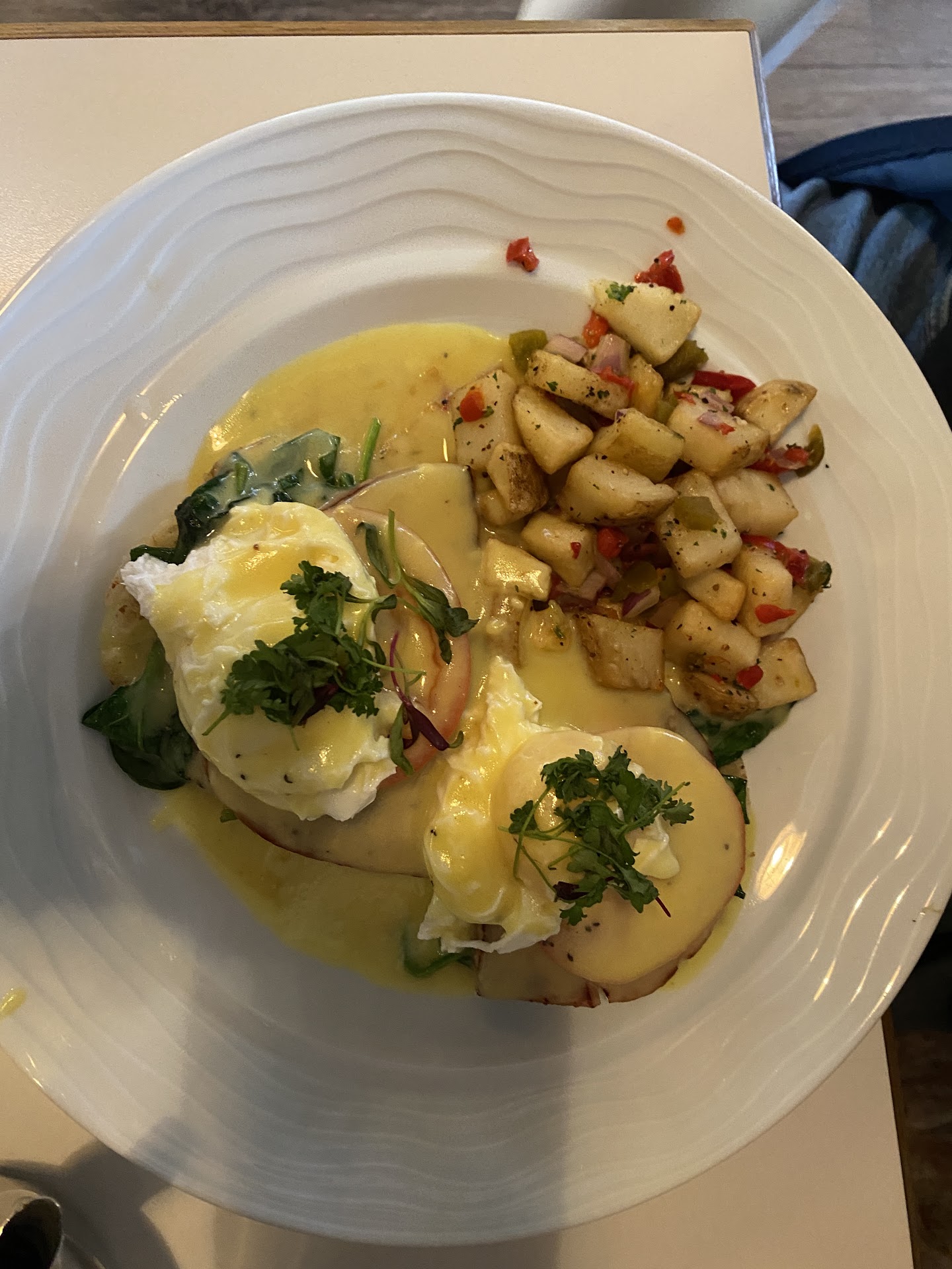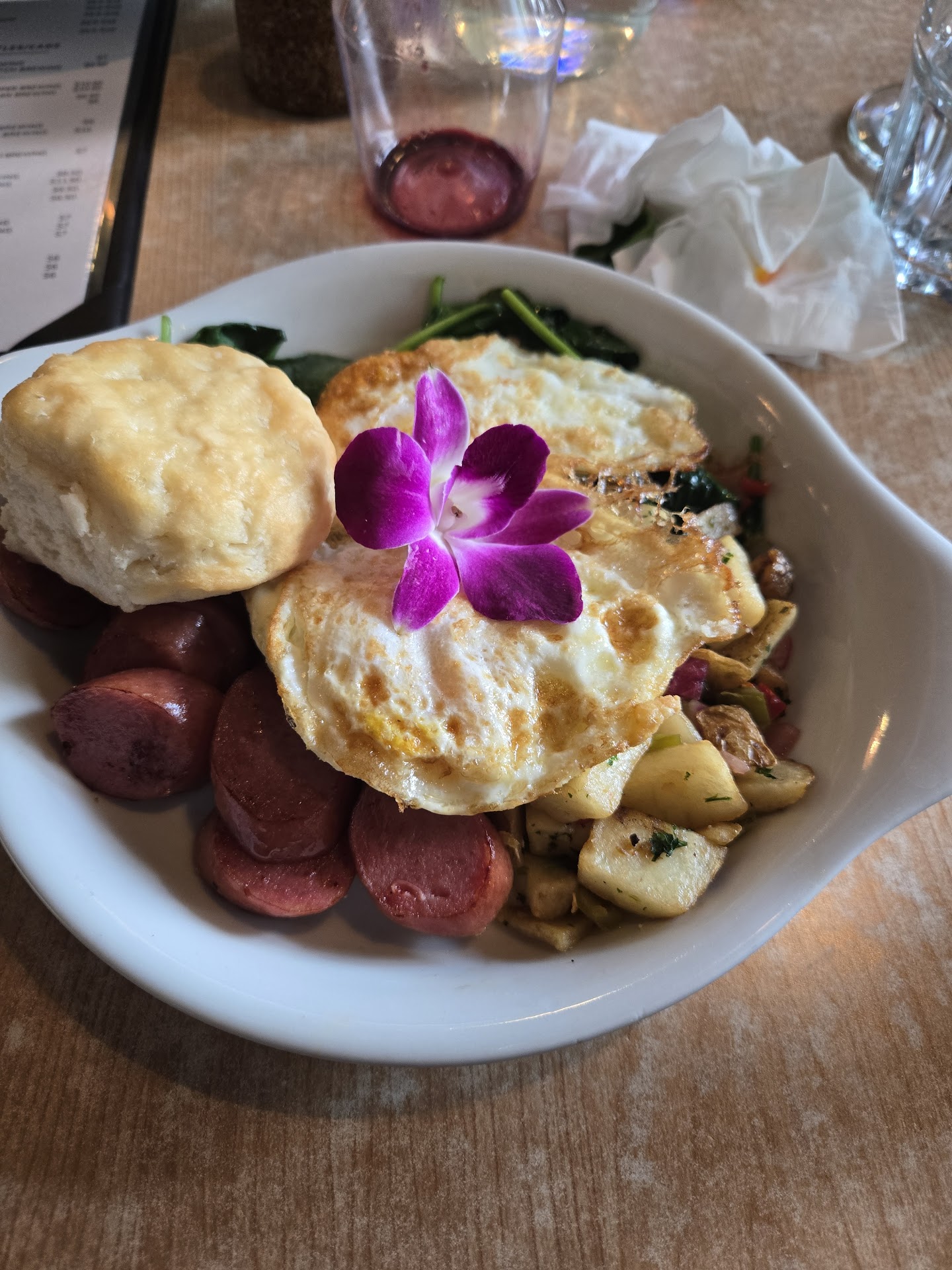 The menu is sprawling enough to cause a minor identity crisis: savory, sweet, traditional, adventurous, it’s all there. I landed on the Meat Lovers Omelet, while my wife chose the 25th Street Stack. She let me taste hers, and let’s be honest, it wasn’t breakfast, it was dessert cleverly sneaking in before noon. My omelet was excellent, cooked just right and served with an orchid flower on top. Yes, an orchid. Nothing makes you feel quite so refined as eating bacon while a flower silently judges your table manners, it elevated the whole plate from “breakfast” to “experience.” A first class touch!