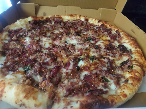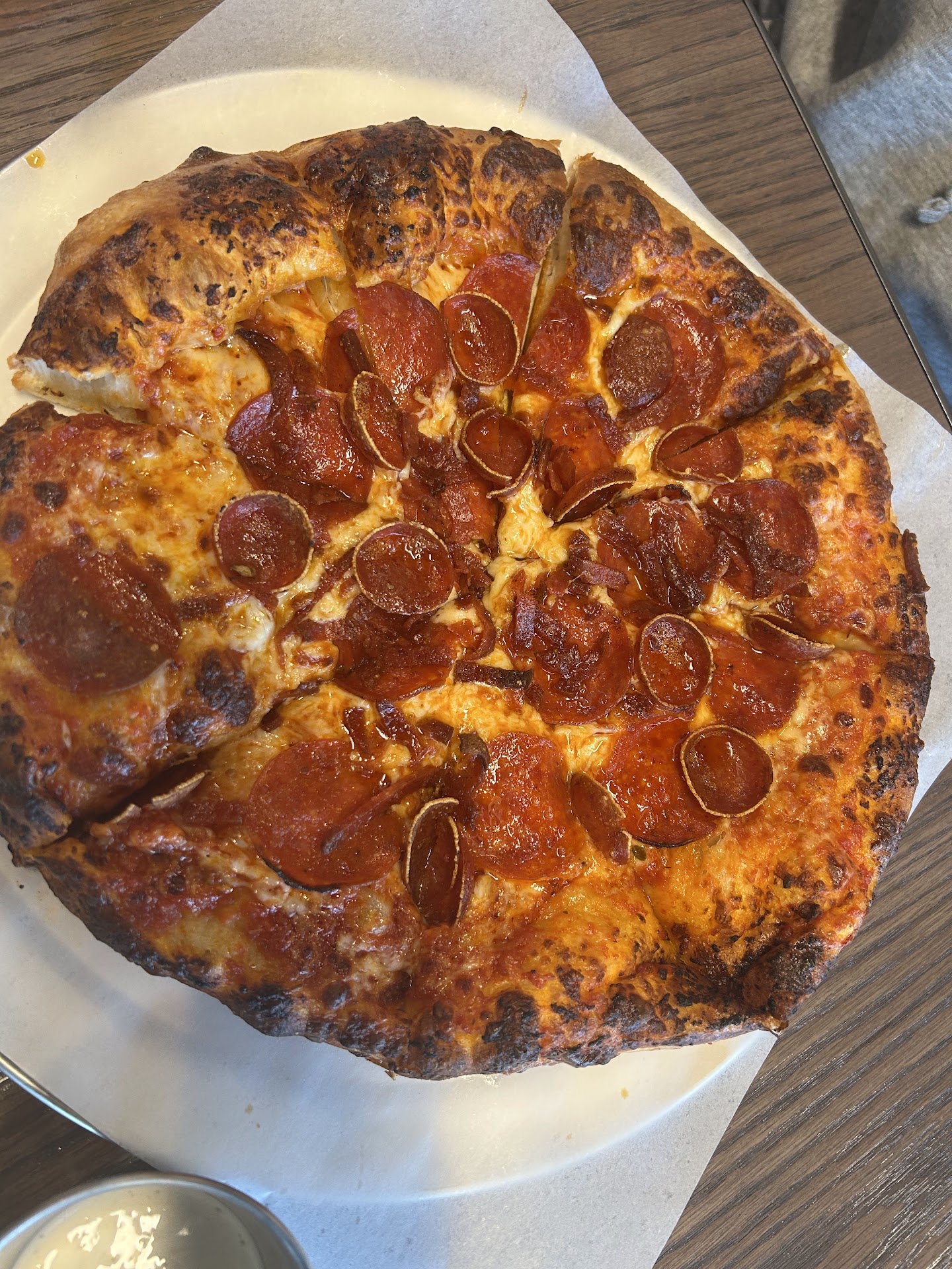 The pizza was middle ground, greasy. Not bad but I can’t imagine craving it over the competition in the area. This fact is unfortunate to me as their takeout location has some of the best pizza I’ve had. They desperately need to add more variety in their pizzas to this location as they do their other. As of now they pretty much have pepperoni, more pepperoni, pepperoni and some meat, everything pizza, and Hawaiian. I was also very disappointed to see they copied the last businesses tactic of only serving personal pizzas. I would’ve loved if this location offered their sizing options at their take out location, at this one. It seems so blatantly copied. Their bar is tiny, so don’t come here just for that. Pricing is what’s to be expected, $14-18$ for a 10” pizza. It also took us approximately 40 minutes to get our pizza, I don’t believe it’s our server to blame but probably poor kitchen management or an inefficient oven/prepping system.
