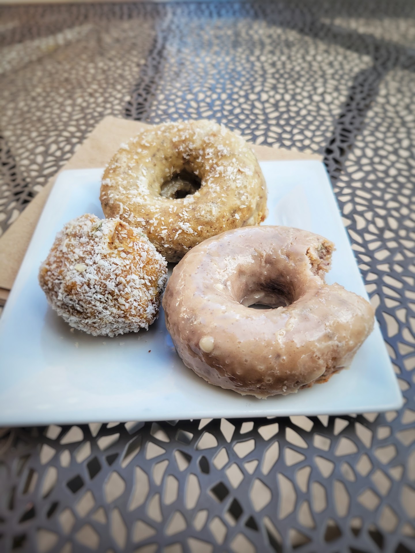 Read moreThis cafe is adorable and super chill. My husband and I came here because we want to start trying new spots that we don't have to bring the kids to. The vibe was super relaxed and the staff was extremely helpful. We tried the tuna bowl and Brussel sprouts bowl, both had fresh ingredients and were very tasty. We also got a Matcha latte with coconut milk, a peach and strawberry lemonade donut, a peanut butter ball and the spinach muffin. We wanted to try as much as possible. The flavors of the donuts and muffin were outstanding. They are all gluten-free so don't expect a gluten texture donut. The donuts were not dry and I can't get over how they nailed their flavors, the strawberry lemonade had a punch of lemonade and the sweet of the strawberry, the peach was so good too, almost like a warm peach cobbler, but the donut was chilled. My husband and I both drooled over the spinach and (feta?) Muffin, I can't remember what cheese, but it was like a flavorful quiche in muffin form. Everything was great in it's own way, I will definitely come back for just the baked goods alone. Thank you for an...