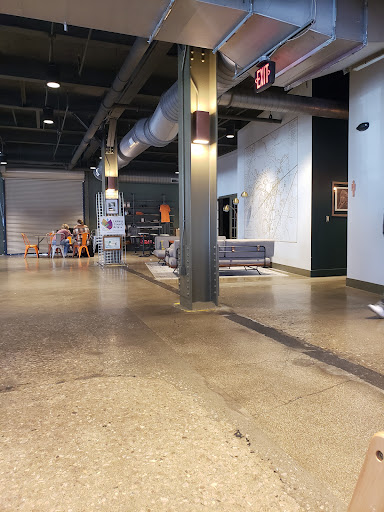 There's plenty of light from two long walls of windows in the form of big glass roll-up garage doors . It was pretty warm inside the day we visited. The dining chairs are the bent tubular steel kind, springy and comfortable with upholstered cushions. There are also some conversation areas with long, minimalist upholstered sofas. We wished these were a little taller. It would be great if they would add some comfy seats that stand a bit higher for those with mobility challenges.