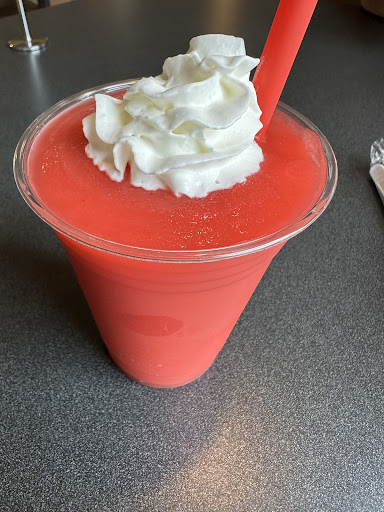 once you receive your food it feels more like a takeout restaurant versus a nice dine-in place. there are no plates, not even paper, to eat off of. we ate the pizza from the box and our salads came in plastic containers that we ate out of also. granted, we didn’t ask for plates so i don’t know if those are offered or not. wrapped plasticware packets are on each table. we ordered the bbq chicken pizza, pepperoni pizza, and side salad. the drink in the picture is a strawberry slushee (contains alcohol). they serve pepsi products, which isn’t listed on the menu, and it’s served in a cup with the can given to you. no one comes around to check on you so if you need something additional you have to get up and find a staff member and ask.