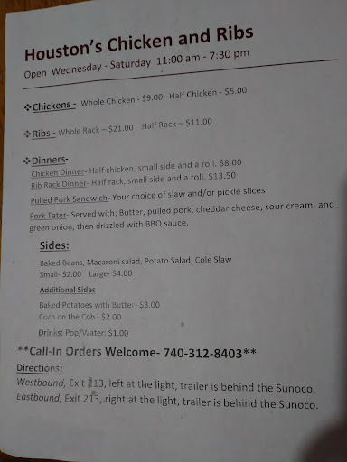 Read moreWe found this little gem quite by accident while stopping for gas. We were on our way home from vacation, and still had a 6 hour drive ahead of us...and smelling that wonderful aroma of chicken and ribs on the smoker sounded so much better than fast food! Everyone there was incredibly nice and even let us sample the ribs before ordering. The ribs were incredible with a great flavor! The chicken was so tender, it fell right off the bone. It was delicious, and the entire family loved it. I'm so glad we stopped when we did and discovered Houston's! I only wish they were closer to home. Just a heads up though....they are open seasonally and for half the week. You can follow them on Facebook...