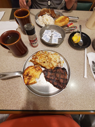 This was our worst iron skillet experience ever! First off the soda was almost nothing but carbonated water. When we brought it to our waitresses attention she replied that they already knew and she would fix it and bring a new one. Her name was Mary just so you know. If they knew it was like this it should have been fixed and not continued serving it to people. Next we ordered and my husbands food came out very good. He had the chicken strip dinner. My food was the meat lovers omelet with no gravy and home fries. When it came out the first thing she said was that the toast would be out in a few minutes. Then I told her I had ordered home fries not hashbrowns and she said that's fine I will have the cook make them right now. Next thing I know she is walking to my table in front of everyone with an empty plate and tells me to scrape the hashbrowns onto it since I don't order them. Wow............really how embarrassing to do that like I ordered them and then didnt pay for them or something,but I did it. I have never been asked to do that when my order was wrong but it is what it is. Next they brought me home fries that were definitely microwaved and soggy. I was also told there were no onions in them and guess what there was.........onions! Oh yeah and she brought the toast out not even toasted just barely warm bread, Worst experience here ever. Usually the staff is loud and obnoxious at this location often screaming to one another across the room and talking amongst each other loudly. But the food is usually still good. The buffet although we didnt get it this time was all dried up and gross looking. I usually do get it but it was in such bad condition that I chose to pass on it. You can look through my other reviews of many places and see I do not leave a bad review if it was not bad service. I am not sure we will ever return to this location and would not recommend...