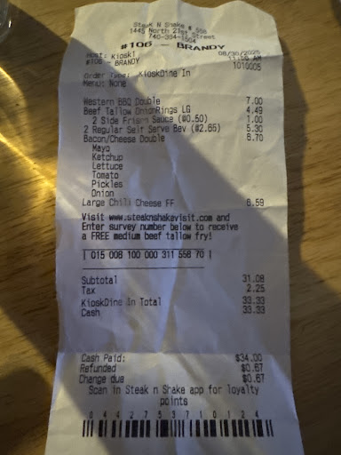 Read moreWe went to this Steak ‘n Shake for lunch. I’ve been to many Steak ‘n Shake restaurants but never this one before. They cheated me out of one of the sandwiches I ordered. It was a $6 burger out of a $50 total meal order... not a big deal, really, especially since I have never had an incorrect order previously at Steak ‘n Shake. However, I am in awe of how the manager handled it when I told her I was missing a cheeseburger from my order. She told me they did not believe me because she “knew for a fact my complete order was sent out on the tray”. . Perhaps they sent one of my burgers to another table… not sure. They probably have cameras and can tell if it was or wasn’t received. But in any event the manager would rather accuse me of trying to scam them out of a $6 burger than adjust my bill or remake the missing burger. My family and I stood there in complete disbelief as this manager was outright calling me a thief. I asked for her name and she ran and hid. I asked her to count the wrappers on my tray as she took it and dumped it in the trash. Wow. I now have to dispute it with my credit card company over such a petty thing. Rude and otherwise shady service. Will not eat here again. Take a video of your meal being delivered to you because if the order is incorrect, they will not make it...