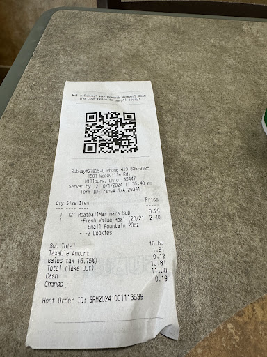 Read moreWent to subway at 1501 Woodville Rd, Millbury, Ohio on Thursday (July at 8pm. Ordered 2 foot longs and 4 cookies. The subs were not toasted. Barely any meat on the subs. The subs were inedible. Fillings tasted old. Did not eat. The cookies tasted like they had been sprayed with a cleaning solution. They were inedible. Did not eat. Spoke to Tim. He said a manager would call the next day. No call. It's been a week so I called them. Spoke to the owner, Shawna. She was very rude and told me I was aggitating her and refused to correct the issue. She then...