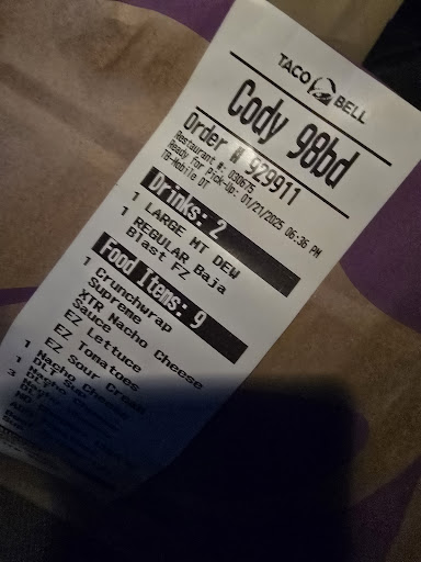 Read moreWas told food would be completed at 648 after ordering at 627. As you can imagine, sitting there for 20 mins kinda sucks. The fact that the 2 cars in front of me took an additional 10 mins each was worse. That I then received food that was actually completed at 636 at 709pm, almost 30 mins after it was finished being made. They just had me sitting there tops it all. Pictures for proof. Was driving away when I grabbed the map ss. I didn't get an apology regarding my wait and was treated with a short attitude. Proof of that too, but upload limit. I also felt a picture of my crunch wrap supreme having approx 1 mg of beef would be a...