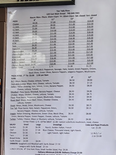 Read moreJust saw all of the reviews saying it's expensive and I find myself confused. Then I realized you guys must be talking about pizza. In my opinion the greatest thing about this place (aside from being a really wonderful local business) is their hot 12 inch subs!!! I think the price may have risen a quarter but last I checked a 12 inch hot sub was $4.50 Which beats the hell out of Subway by the way. Our favorites are the Pizza Sub and the Italian Sub. They are huge, lots of meat, insane amounts of hot ooey gooey cheese. You really cannot order a sub from here and not be thrilled. So if Too Talls is anywhere near you scrounge up $4.50 grab one and then when you realize I'm right c'mon back here and show some support for a really fantastic local business!