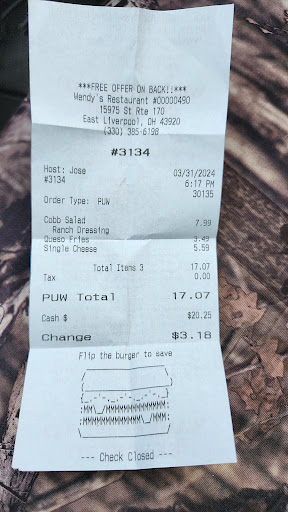 Do not GO TO Wendy's IN CALCUTTA OHIO... Went into the store and stood at the counter for nearly 3 minutes until the staff was done playing on their phone and come over and finally took our order. When we got our order and went over to the fountain pop center notice how nasty and disgusting it was as a Wendy's employee was just leaving and seen how dirty it was nothing was done to clean it up as well as garbage and trash smeared all over the garbage can and garbage all over the floor and tables. Nobody there except for one other person in the restaurant so there was no reason for the slop everywhere in Wendy's and when we got our food I got the wrong sandwich it was supposed to have been spicy chicken they gave me a regular chicken and it's been there since early in the morning because it was very dry very tough and nasty my fries were cold and the salad had black on the lettuce so practically we just threw our food out and left not worth saying anything to the staff because they seem the slot that they were giving so we will not visit this...