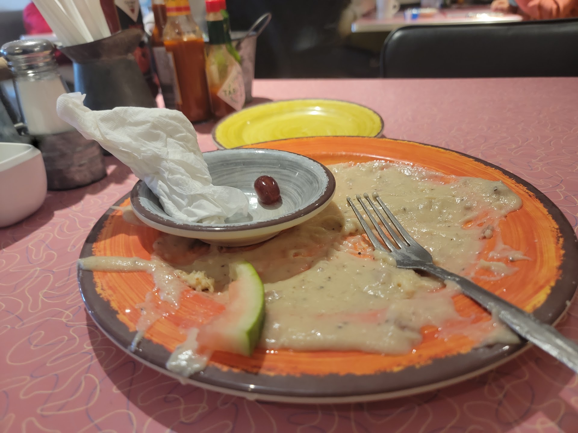 I ordered Dennis' Country Special. What a foul monstrosity. I don't know what kind of degenerates they have out in the country in these parts, but thick slightly sweet whitish gravy that's slightly separating after being reheated with small chunks of dried out sausage in it draped over, no, drowning 2 biscuits that a self respecting restaurant would give out for free before the meal, that, that's not breakfast. Fortunately I am myself quite degenerate so I mopped up that tepid thigh thickener with enthusiasm.