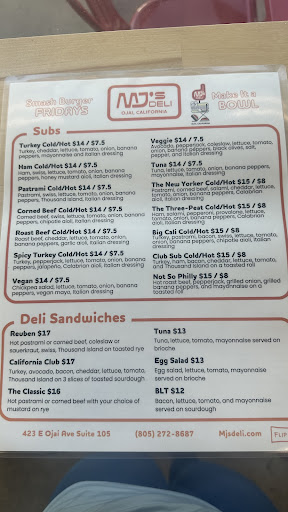Amazing deli! We were starving after a hike & MJ’s did not disappoint. We had the New Yorker, the Big Cali, the potato salad, & two pickles to go. Bummed they did not toast my sandwich while I asked for it hot, but they did toast my husband’s, & the cashier was also being trained so she may have just missed it. That slight disappointment went away very quickly though because the sandwich was soooooo good. Like, talking about if we could do the 45 min drive to MJ’s from our place just to come back again good, lol. We both also really liked the potato salad, tasted very “pickley” with tons of dill as well. If you’re not into pickles, the flavor may be a bit strong, but we loved it. Small place, a couple tables outside & some barstools inside, but don’t overlook this place! It’s right next to some larger restaurants that may have more reviews, but this is definitely one to check out. Got lucky with parking for lunchtime on a Sunday, but definitely not tons of spaces for the amount of shops/ restaurants in this area. The usual downtown Ojai parking...
