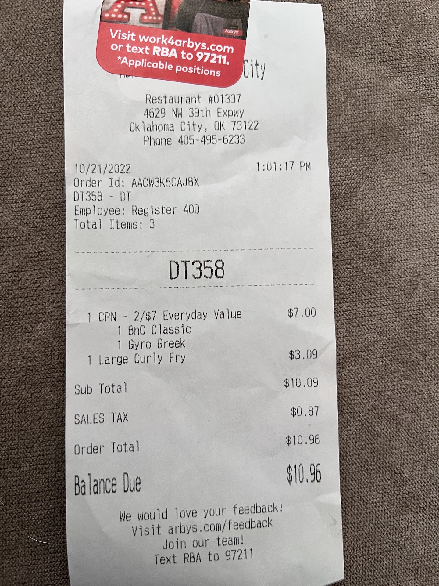 Ā Ā Ā Read moreI ordered a big bac9n cheeseburger and a large curly fries, the bacon part of it was raw still was slimy and disgusting, the burger patty was trying to be pink nice but was even bloody raw, tasted ur special two deli cheese and horsey sauce it took to try to eat the disgusting sandwich, the order of fries was awful u gave me all the bits and pieces of the fryer like oil net remains, I used to find going to that Arby's in 1980's really neat here in oklahoma with the Native American fact of our state hood pressesence- the hygiene of one of ur Cook like his or she personally self should not be putting a meal together at a sandwich delivery and deli national chain, I can't believe I wasted that much money on ur disgusting burger and pieces box large of fries. Hope ur location fixes it or losses its business and goes under gone and closed and gone for good from ripping people like myself off trying to catch a late sat lunch. One of the most disgusting meals I ever paid for. Like I would rather pay someone to gut punch for 5hrs for the same $ than ordered that...