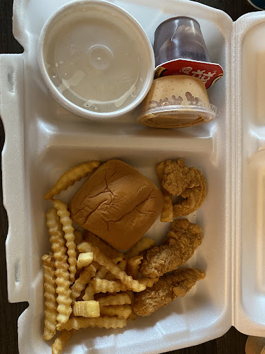 I asked him how he was doing and he said he was hungry and so I offered him to grab something to eat. So we went in.. I went to the counter and let him choose what to eat and he choose to get some chicken strips and I bought him the meal..