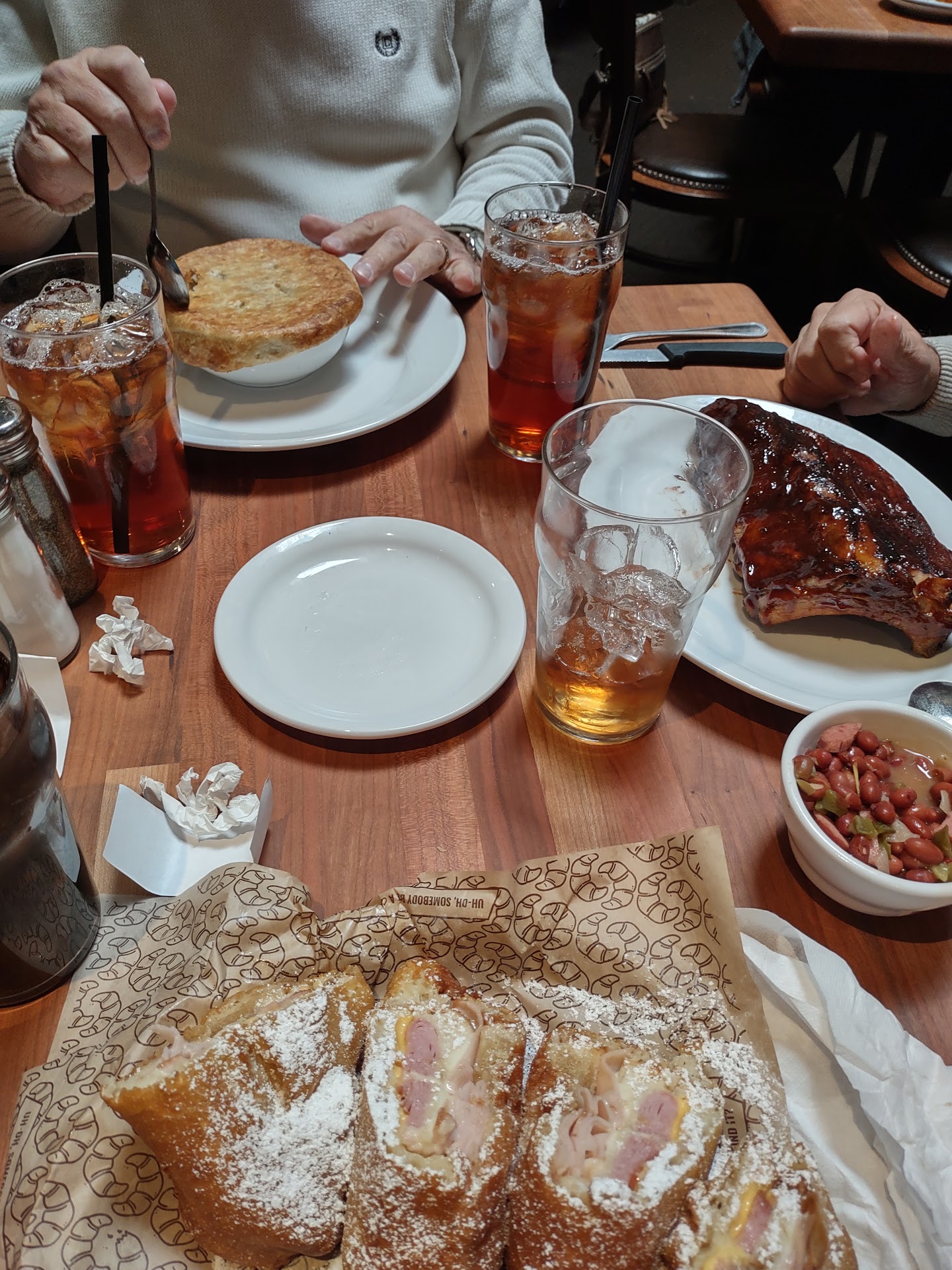 The food itself is fine. To start, we were brought out some amazing croissants, with a drizzled honey butter topping that evokes the imagination. The Monte Cristo was perfectly of the type, well-fried and full of the usual things in such a gourmet-and-fit-for-a-gourmand offering, though the raspberry jelly that usually accompanies this was erroneously omitted, and it took a few minutes to arrive upon request. I tasted the chicken pot pie that a friend had. While I thought that it, too, was well made, albeit with canned vegetables that nonetheless allowed the sensible price of it, the sauce in the filling was a bit bland and in need of seasoning, though I could see this meeting a few people's tastes. The ribs were fall-off-the-bone, which is again to many people's tastes, but they were simply overcooked. Dishes were attempted to be cleared while we were still enjoying our food.
