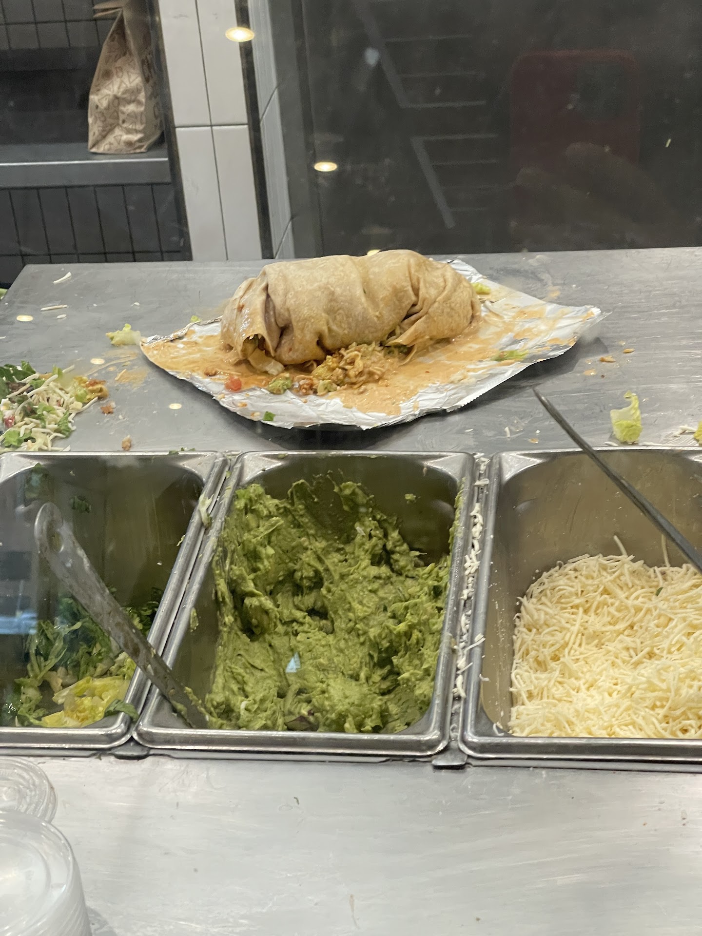 We go down the line and everything is empty, and lord have mercy, the line where they make the food was severely unkempt and was a mess. My girl asked for barbacoa, “Nope”! Try again they stated. Bummed out she said she’ll take chicken,” Nope “! Out of that too. She was forced to get steak. Pretty shocked by their attitude and how care free the staff was I just kept down the line trying my best to hold my tongue. We get to the part for the vegetables and what do you know, no lettuce and no cheese either! Is this Chipotle or a taco truck behind a Home Depot’? The guy making our burrito got some frozen cheese from the freezer and took a basketball scoop and plastered it on my burrito, making 75% of my burrito a frozen dairy ice cream cone. My girl was so turned off by the attitude from the girl making her burrito, as she was barely giving her any helpings as it looked like she was trying to conserve, that our burritos couldn’t of come out different in the end. Mine a frozen cheese explosion, hers a potato that lost its soul. To be charged Chipotle prices for these abominations is hysterical.