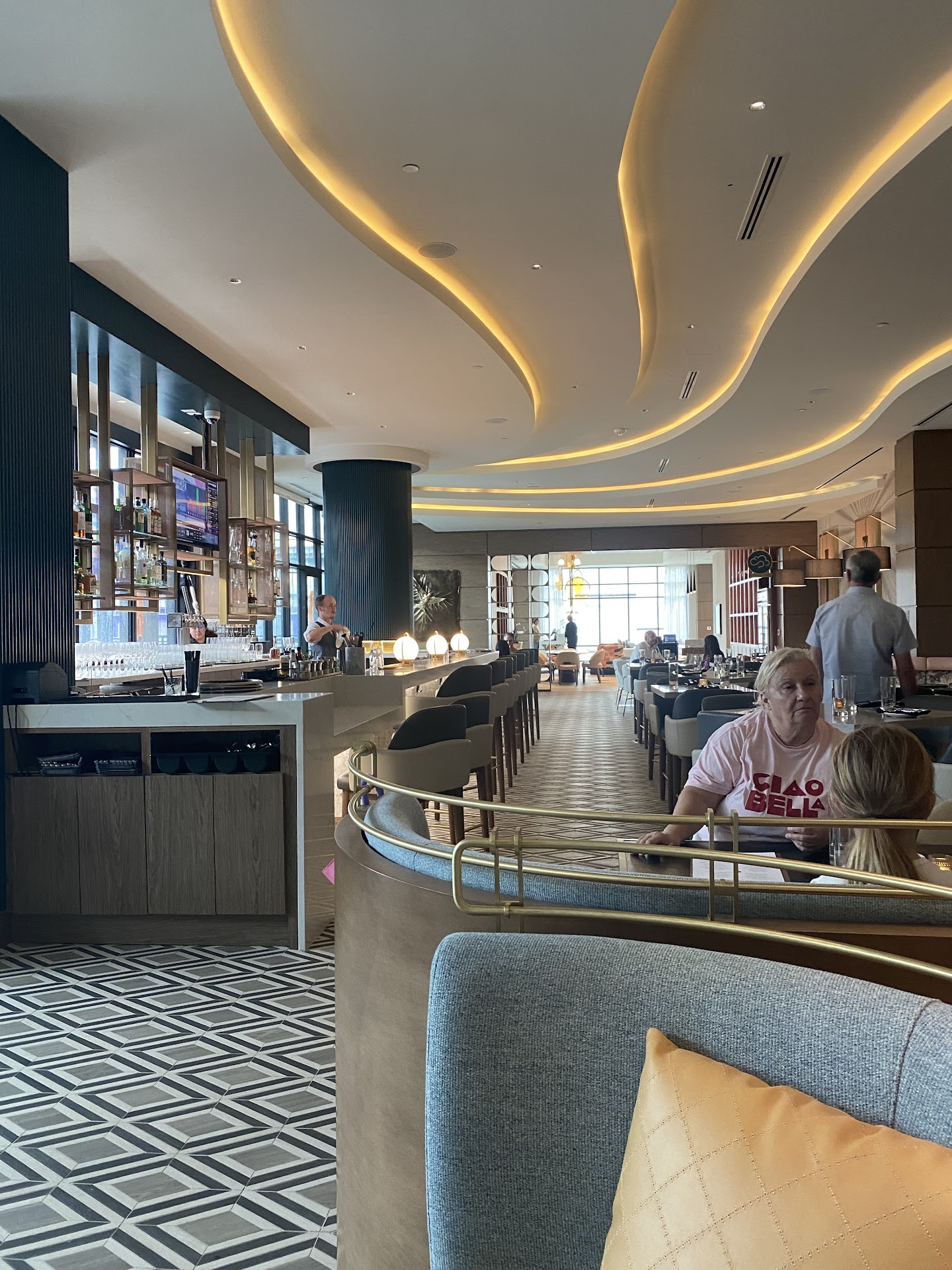 The atmosphere is incredible! This is a beautiful restaurant. My husband and I made a reservation for our wedding anniversary here the other weekend which was probably a mistake on my part because, while beautiful, this is a hotel restaurant with a large bar and we were there on a Friday night. It wasn't quite the quiet, fine-dining experience we had hoped for but, hey, that's just part of trying new things. Personally, I thought that the manchego grits and the steak in the steak frites could have used a little acid for depth of flavor but my husband loved both so that's probably a palette issue specific to me. I do wish our server had been a little more attentive. Maybe it's just me, but when I spring for a bottle of wine at a restaurant, I want the experience of having my glass filled for me which didn't happen. Also, our waitress took my knife when she cleared the table of our appetizer, but she didn't bring me a new one. I was trying to catch her attention, but since my husband ordered the steak frites he had a steak knife and was able to give me his butter knife to eat my meal. I think my biggest issue is that, even though we noted this was our anniversary in the reservation, we were seated to the side of the bar almost directly in front of where the servers had to enter/exit the bar to get drinks and whatnot. We had servers and staff squeezing between us and the empty table next to us all night. Other than a group of folks standing by the bar there were only one or two other couples dining when we came in and I wish they had sat us almost anywhere else that would have felt a little more relaxed. I can understand getting squeezed in if we hadn't made a reservation and the place was packed but that just wasn't the case. It just felt really disappointing for the price point/experience we...