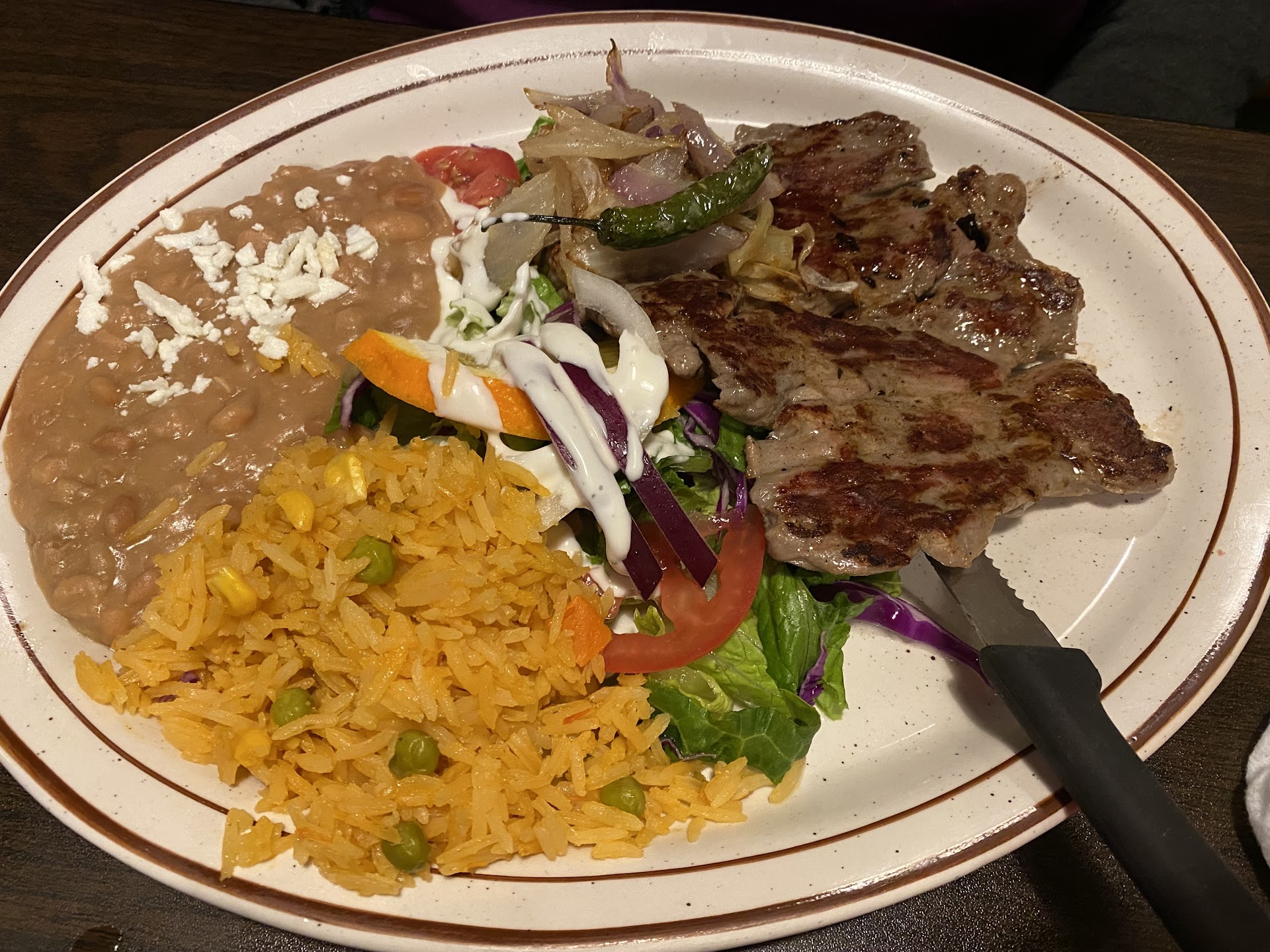 The experience as a whole was just not good. I had read the bad reviews and thought, it’s mainly customer service so it can’t be THAT BAD. Oh goodness. The initial greeting was warm and welcoming. Then we sat down and ordered 1 pupusa, 1 special breakfast, the birria meal and 2 drinks. One being a soda and the other a pineapple water. The salsa and queso tasted like they came out of a can. Then came the main course and the only thing we both agreed tasted good, was the beans. The birria lacked all flavor and the special breakfast was very salty! The pupusa was dry and didn’t even come with sauce. We should have known better than to order a pupusa at a Mexican restaurant. The pineapple drink (agua de piña) was great!