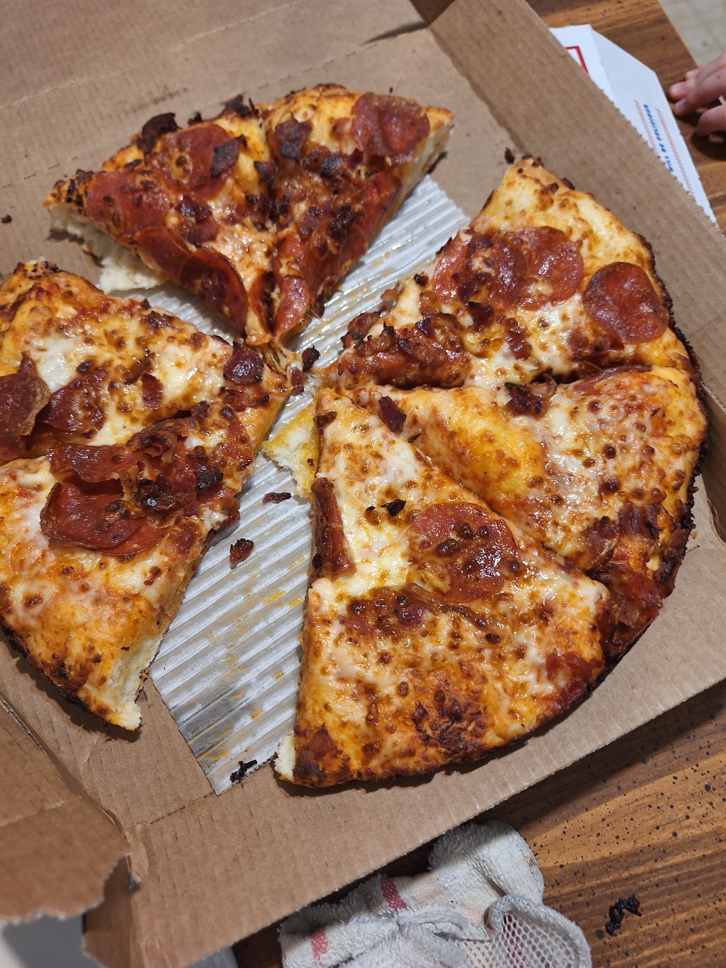Ordered 2 pizzas today to feed the homeless in downtown OKC. When we pulled the 1st slice from the pizza, a 4-5 inch black hair hung from it. They no longer wanted to eat this pizza and I don't blame them.