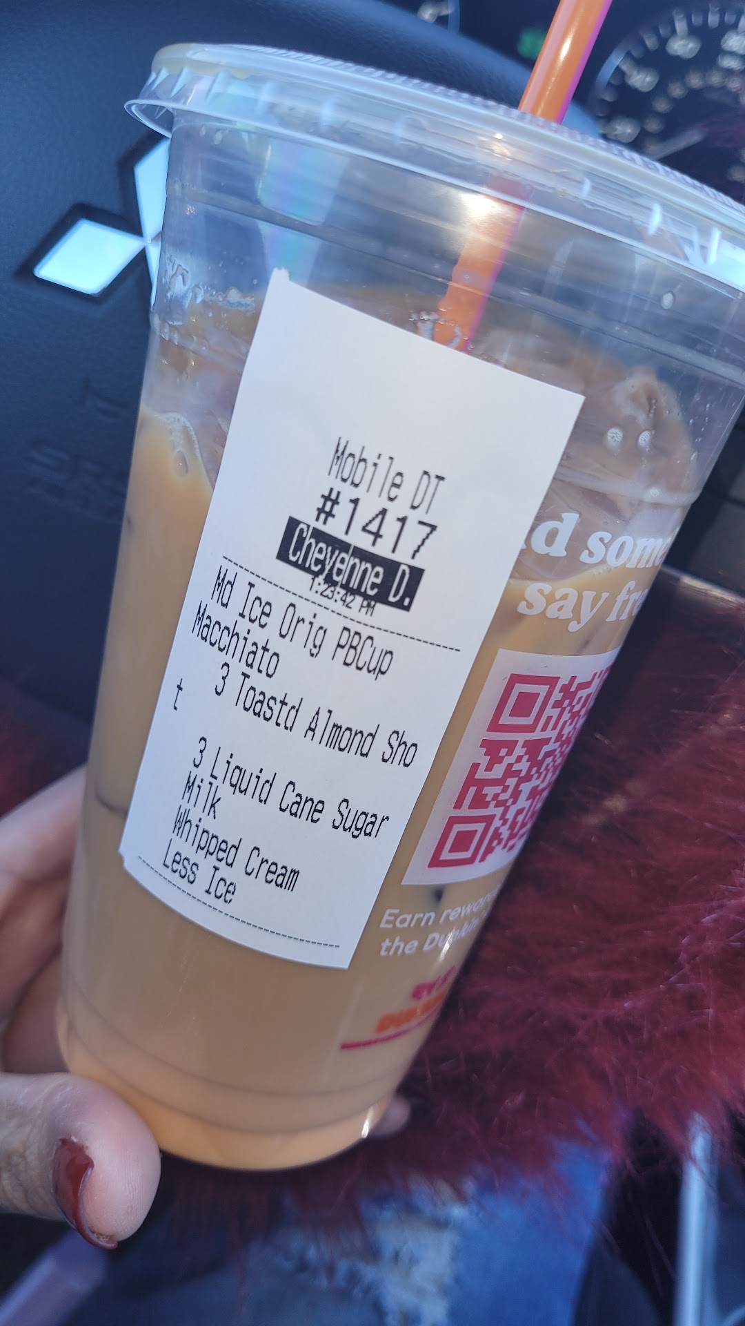 Ā Ā Ā Read moreGiving 5 stars for the service! I feel like there's always a hit and miss. I love dunkin. They do me wrong more times than others. If I order on the app- it's not made right. Drive thru is most convenient and sometimes I have to ask if my shots have been added and after being assured I drive away only to taste the bitter coffee of only what I can assume feels like a person who goes home alone every night sulking on a deep depression because life ain't hitting right. I DO give recognition to the service. Even though the girls seem stressed out and overworked- I have seen a few smiles and thank yous. There is a guy who worked in the afternoon who made my large iced signature peppermint mocha with all my extras and I caught a glimpse of him ACTUALLY stirring it and I nearly lost my s%$*. Thank you sir because that went a long way for me and I did tip for that! Photo is exhibit A. Ordered through the app only to find my drink was missing the liquid cane sugar and the whipped cream. It easy to ask why I didn't go back or have them fix it. Answer being I have a 30 minute commute. I make myself late to work to get my fix. I don't mind it. My employer does but I am the example of poor time management of a mom of 3 kids. We don't have time...