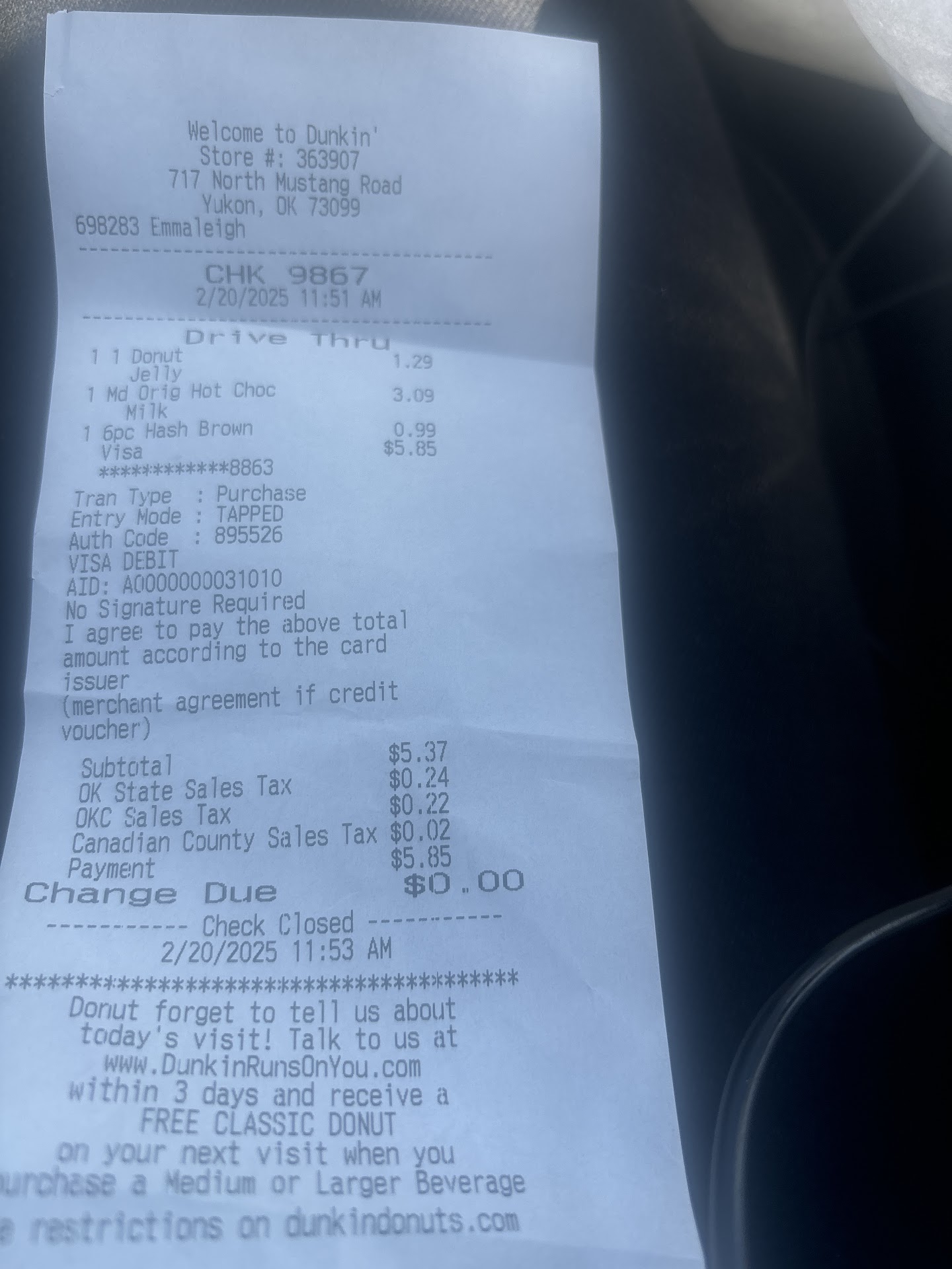 Ā Ā Ā Read moreMy experience did not start out good. I was very displeased with my order. The reason I gave this DD 5 stars is due to the effort they put forth to make it right. Sasha did an amazing job showing me that she cared and even offered to personally make sure that my order was corrected the next time I came in. I see that there are some negative comments about this specific site, but if you just blast them on Facebook or on a Google review and donāt contact them, how will they know what happened so they can get better? This is a new facility so please show them some grace and if you are dissatisfied, call them and let them know what your problem is. That is how they will get better...