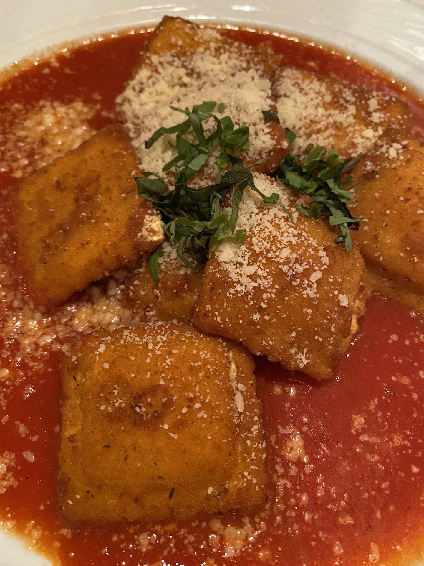It was basically six toasted Ravioli in a salad plate with a cm of tomato sauce, garnished with julienne basil and parmigiano cheese. Speaking of the tomato sauce, it was really strained. Maybe a little "too" strained. They must have used a China cap and cheese cloth a bunch of times. Must be why there was no real flavor besides tomato. They strained it so good that they strained the flavor of the herbs out of it. So I guess you could say it was pretty much Campbell's soup. Except it was cold. Alright it wasn't cold-cold but it was below room temperature. It went well with the beer. Except the beer might have been a little warmer than that soup. I mean Tomato sauce. The beer was good. I had the Full Sail Amber. I have a really good alcohol tolerance though for sure. I know this because after I drank the beer it was like I was just drinking a non-alcoholic beer. No buzz. Not that I wanted one, because I was driving. It tasted...