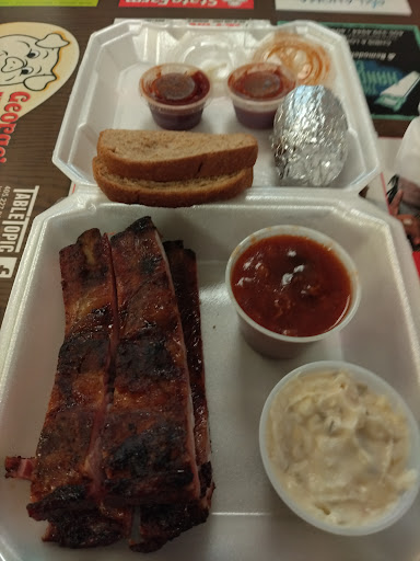 Read moreI have had the pleasure of tasting soulfood all over the United States from Cali to NY down to the Deep South an lawd have mercy. If i could give George's a 10 star I WOULD. I was looking for some cobbler after a long day of work an found this spot. The cobbler was TOO delicious. It was so good I had to come back the very next day to try the food. I decided to get the 2 meat combo with ribs an brisket, bbq beans, potato salad and of course another peach cobb for my troubles. Lol. The meat was phenomenal. I dont know who cooked the ribs an brisket but they deserve a trophy. I was blown away by how flavorful everything was an how it was so tender an fell right off the bone, im really not doing them any justice. And to top it off everything was affordable. The only thing I'll complain about is the fact that I was not able to eat it all in one sitting lol. After eating half of my plate I had no room for my cobbler 😩😂 These about to be some fire leftovers. Also must mention that the customer service was Top Tier, everyone was very helpful and welcoming. I loved the decor an the Kobe portrait. Highly Recommend 10 out of 10. Pro tip - The hot BBQ sauce is hot so make sure you ask for hot an reg...