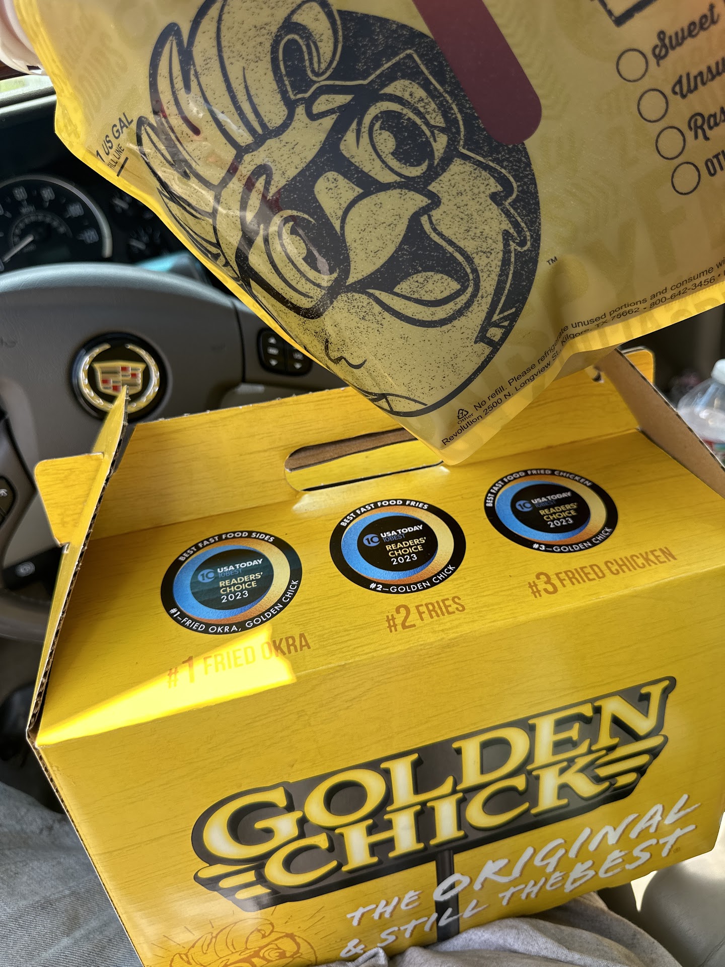 Read morePulled up to Golden chick 12:30pm Rushing to get me some lunch. Already frustrated that my day is going behind schedule. So my anxiety is at all-time high. The gentleman on the intercom prompt with a small joke, and proceeded to ask me what would I like to order. Not usual I thought!! But he did take my mind off of the pressing time. Looking over the menu, I ordered quick. I’m us to spending somewhere around $50-$60 to feed my family of six. With him helping guide me to a cheaper deal.. 18 tenders, 2 side 8 rolls & a gallon Tea all for $45.60. I JUMPED ON IT!! He continued to crack 1 more JK as I proceeded to the window.. I Thought to myself!! I don’t feel so rushed now. I took a deep breath & attempted to give the gentleman the same energy in return. Looked @ him & said (THERES A ART IN WHAT YOUR DOING) he laughed and gave the credit to his Trainer. John & T if I’m not mistaken. A Black Man & White Gentlemen racial differences to the side with crazy good customer services. They told me if the experience was that good make a review, so here I am. GOOD JOB GUYS. I even got a cool Golden Chick carrying box instead of the usual bag...