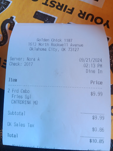Read moreThe quality of the food at the NW 16th and Rockwell location has definitely went downhill. My son and I used to eat there alot mainly getting the catfish dinner. It had been about 3 months since we had been there and decided to get our usual the catfish. I even got a piece of fried chicken on the side. Needless to say it was horrible. We had to wait forever and then the catfish was like rubber. The piece of chicken was so greasy I couldn't eat it. Also the coating was so hard I could hardly chew it. The catfish was also cold. I figured it must have been a one time thing so i tried their chicken sandwich combo today for lunch to give them another chance. It looked so good on tv. But again it was horrible. The chicken was like rubber and the coating was hard as a rock. The cheese was like glue on the bread like it had been microwaved too long. The sauce had a weird tang to it. The roll was actually good but that was it. The fries which I used to love were really hard on the ends. I really wasted 7.59 at a time when I don't have it laying around to waste. It was actually suppose to be a treat for me to get takeout for lunch. But needless to say I have learned my lesson. I will not be eating at Golden Chick again. Between my son and I we have now wasted almost $30.00 on horrible tasting food. I shouldn't even give it one star except the roll was good on the sandwich. Definitely not what...