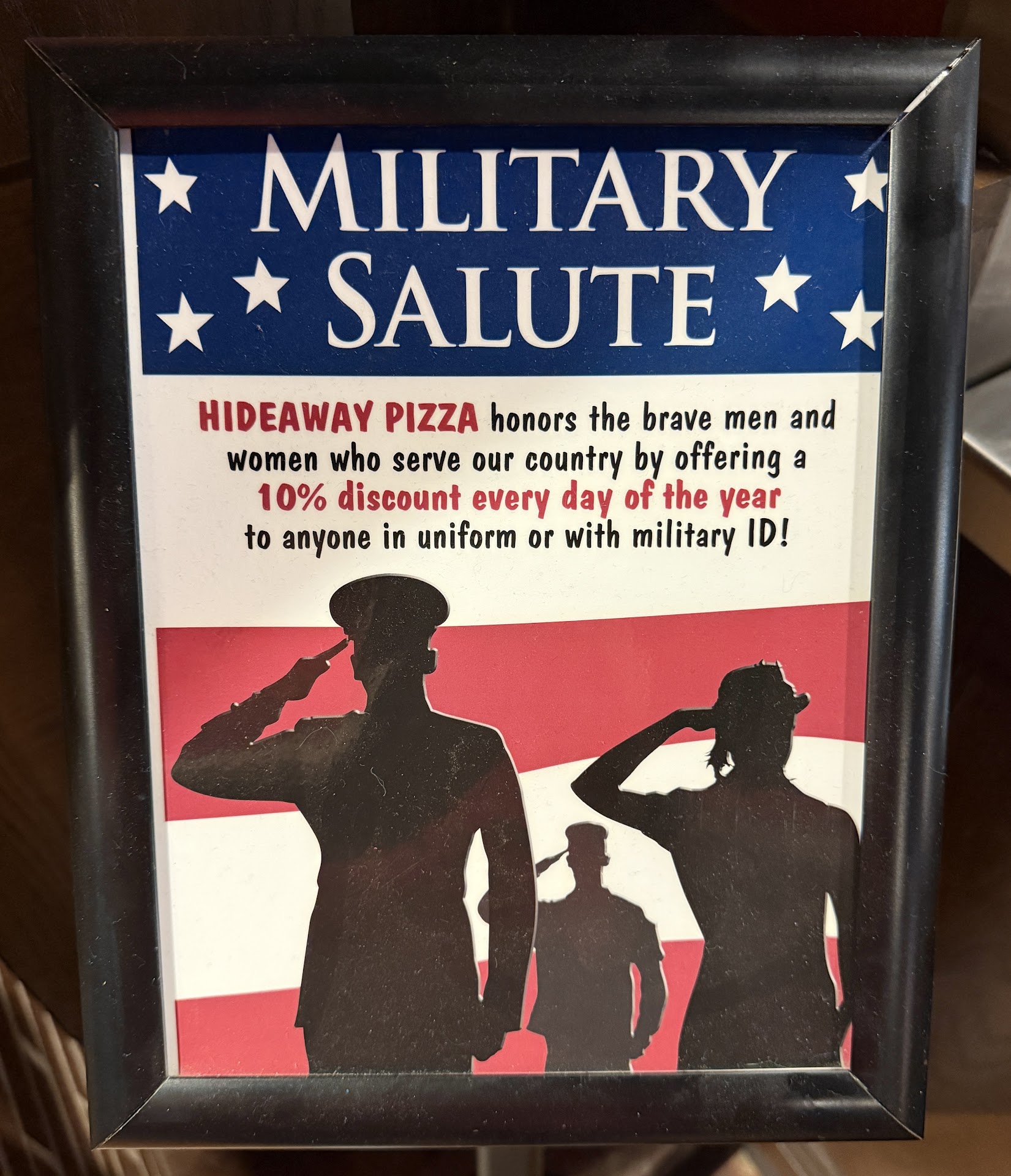 When you first come in there is a window where you can see the cooks making your pizza. They also have a bar for beer and mixed drinks. The decor is a little dark with big booths which is just like the old days , so I like it. They also give a 10% Military Discount which I appreciate since I'm a Veteran and not my places do that anymore. I was pretty impressed with the restaurant and the employees were friendly and attentive. I would definitely recommend you coming to Hideaway Pizza to experience the good old days of eating out with the family and having a good hot and fresh pizza and spending time...