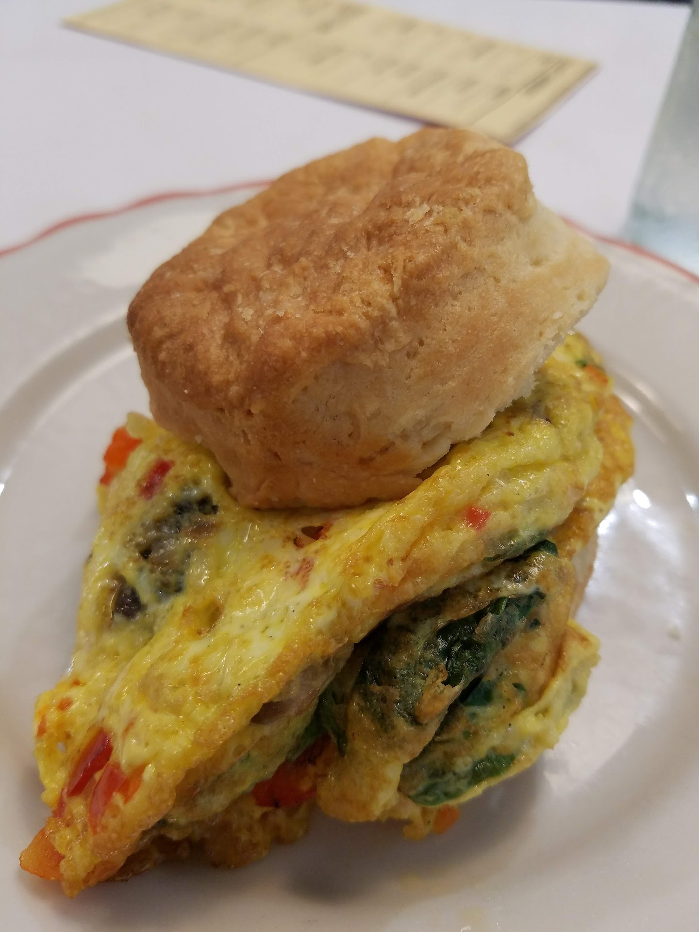 In conclusion when it comes down to the food at Hunny Bunny Biscuit Co. The only way to properly describe it is one of one, which means the food is unparalleled to any other that I've tasted in my 3 years of being a food critique in which not only can assure you that you will too. The first meal I ordered was called "Veggie Scramble" it's an omelet with a soft, and fluffy biscuit, the eggs that composed the omelet were cooked to perfection they had a creamy rich taste and each bite I took the more, and more various flavors would come together from the crunchiness of the bell peppers to the smoothness of the mushrooms and spinach, yet in the center of everything is fresh goat...