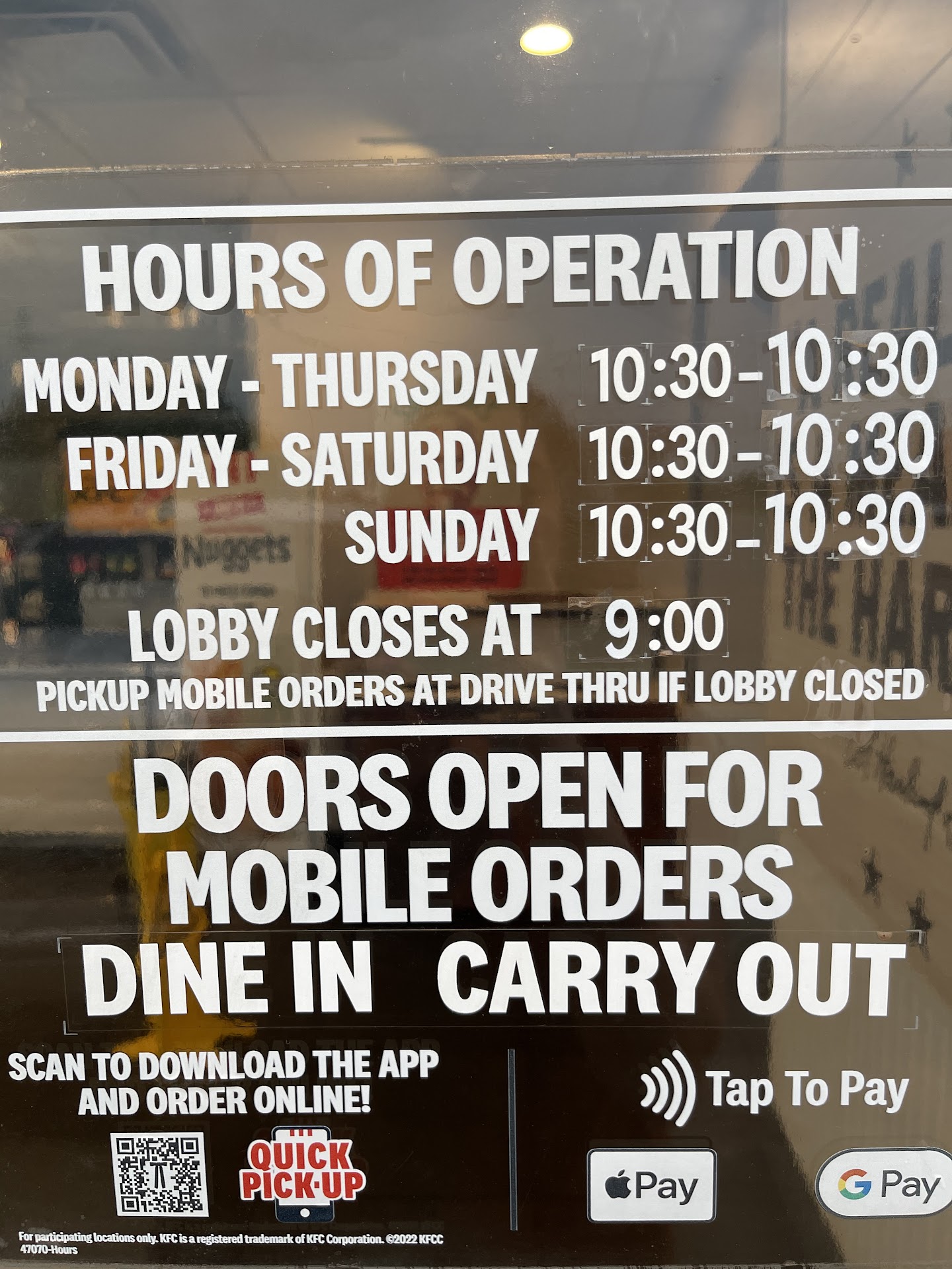 Read morePaid forty something dollars... like $46 and change I'm not sure, because I got no receipt But paid a lot for a 16 piece original meal plus I added the Georgia Gold 2 piece. Get home and find one bucket with the tiniest legs and wings I've ever seen, so small that the bucket looked less than half full. Pieces were super greasy and most of the breading torn off or fallen off. The other bucket had the thighs and breasts...also tiny. The Georgia gold chicken was extra, extra greasy and although I got the two mashed potatoes and gravy I asked for with my meal, I got NO coleslaw and No biscuits. You get 4 large sides with a 16pc- and 8 biscuits. Heck no 👎🏼 I've tried calling twice so far, no answer at all. I'll keep calling. I'm not usually one to complain but I'm pretty disappointed with what I got for my money. KFC is expensive to be getting pigeon sized pieces, and especially if they are bald and GREASY! I also had to wait for like 10-15 minutes before they got on the intercom to take my order. I am not a happy customer tonight I gave them one star only because the lady at the window...