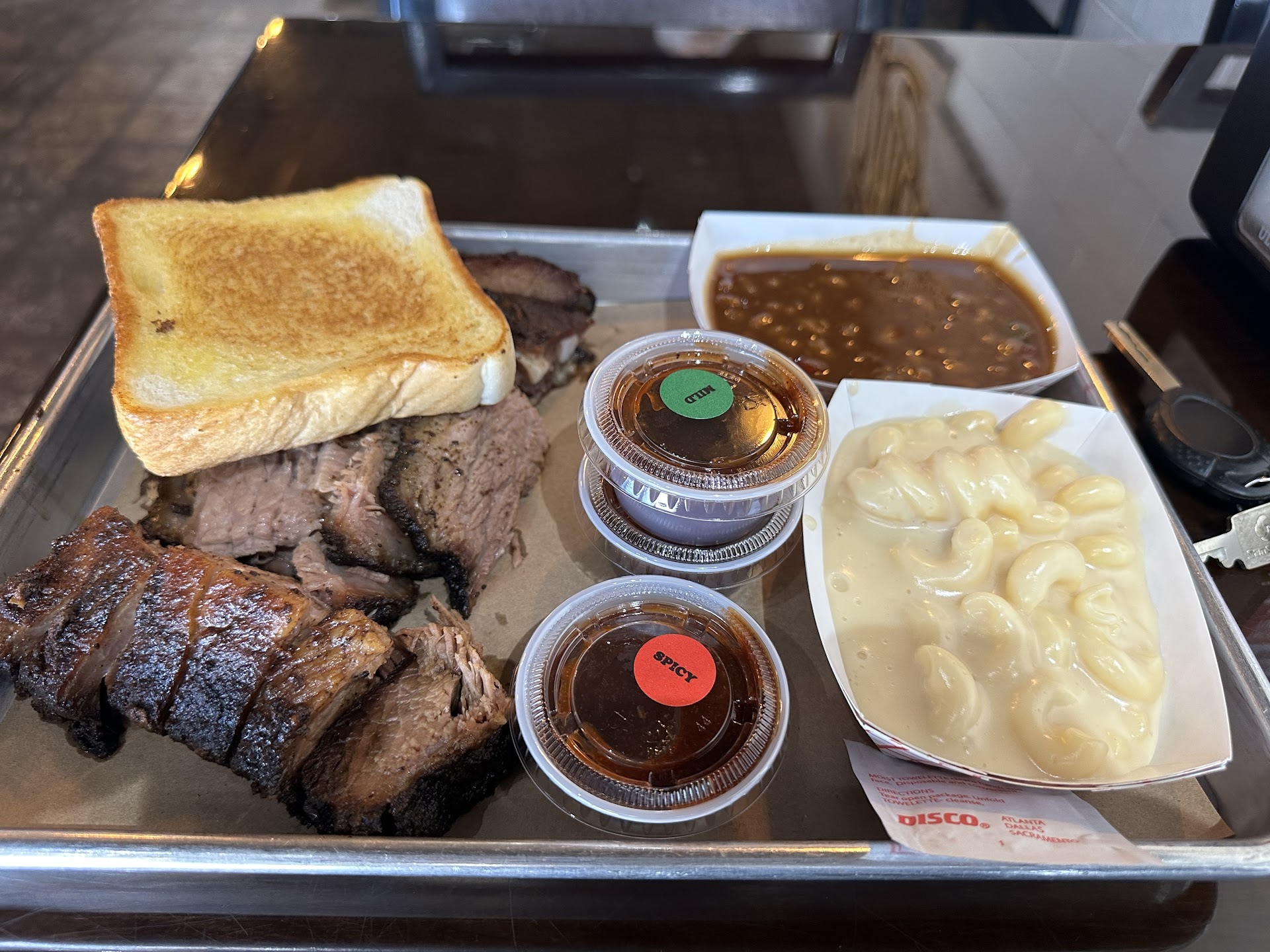 The sides: Sorry guys. The baked beans I had were so sweet I couldnāt take a second bite. Couldnāt taste smoke or anything other than tomato sauce cumin and sugar. Thatās just my palate. I know some people sugar brown sugar beans and maple syrup beans and all the like. I prefer the savory style cooked with chopped brisket and trimmings. Mac & Cheese: again not my palate. It was runny, like really runny. They donāt bake it. Cheese flavor was processed and didnāt have that homestyle look or taste at all. On the flip side I did mop up all the extra cheese sauce with my toast. I would have like the option for some onions and pickles. The sauce: tasted suspiciously like sweet baby rays. The spicy sauce; spicy sweet baby rayās too too too sweet for me guys. Next time Iām going to be the weirdo who pulls a flask of Carolina red out of his pocket at the table.
