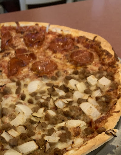 So of five: one star for being local, one for a friendly if not terribly helpful staff, and one for tasty pizza, but two stars definitely docked for a grimy dine-in with arbitrary discounts.