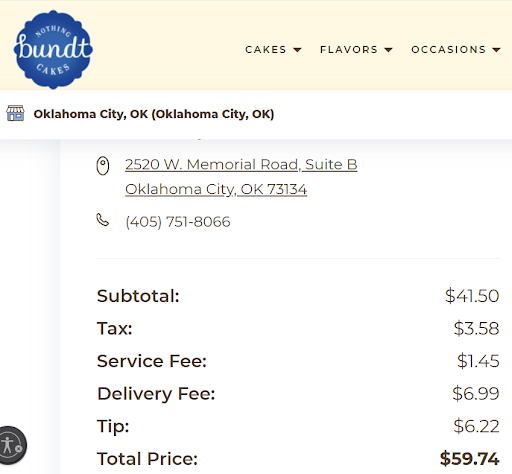 I ordered a $40 cake online for delivery to a friend (I live in Texas), but my total ended up being $60 after tax, service fees, delivery fees, and an automatic 15% tip. The tipping option wasn’t customizable. Wanting to cancel the order, I tried calling the store for two days, only to be met with a holiday voicemail. I eventually had to call another Nothing Bundt Cakes location and ask them to notify the owner that the holiday message was still active.